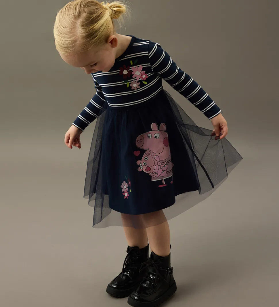 Elegant Name It kjole i navyblå med vandrette, hvide striber. Name It kjolen har et skørt bestående af et lag bomuld og et lag tyl, hvor der er print af to Gurli Gris karakterer og blomster på det inderste lag. Kjolen har en rund halsudskæring og lange ærmer.