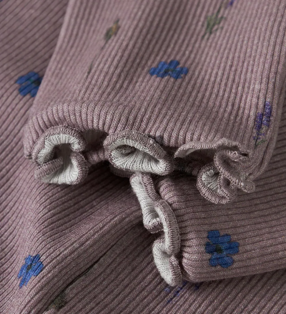 Charmerende Name It leggings i støvet lilla dekoreret med et blomstermønster i blå og grønne nuancer. Name It leggingsene har en behagelig elastisk talje og en elegant ribstruktur, der tilføjer en visuel dybde. Buksebenene har flotte, bølgende kanter.