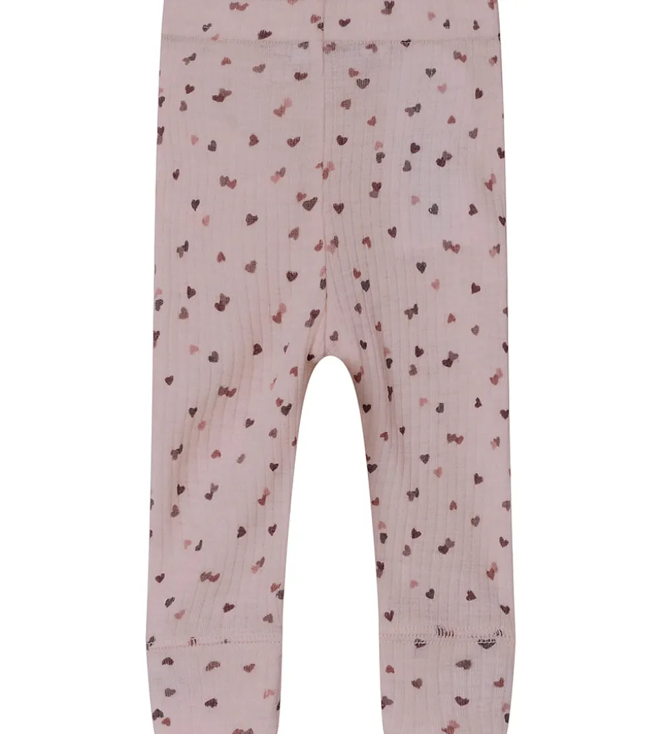 Flotte Name It leggings i rosa med et alloverprint af små hjerter i forskellige farver. Legginsene har ribstruktur og en god elastik i taljen. De har brede ribkanter ved anklerne. Legginsene er fremstillet af merinould og modal.