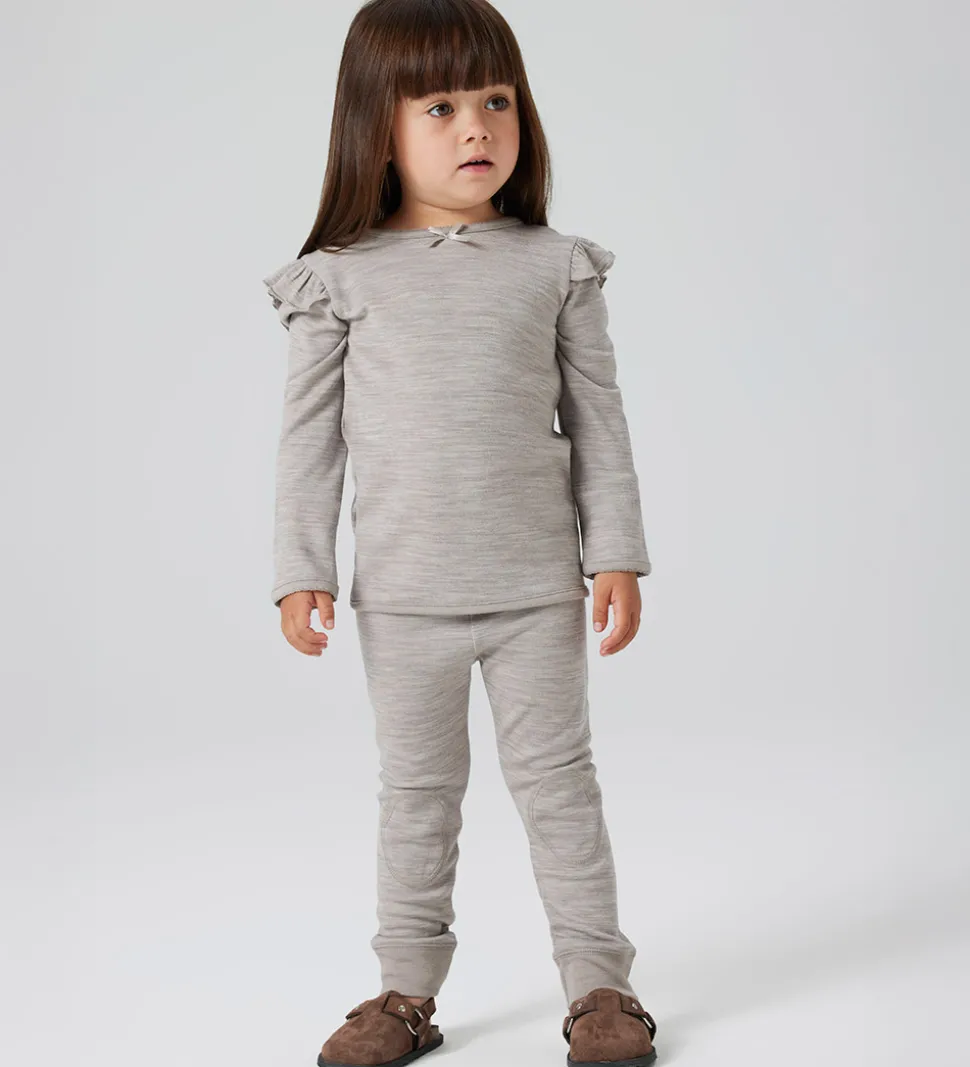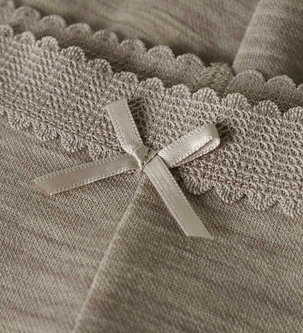 Lækre Name It leggings i meleret gråbrun med en dekorativ sløjfe foran og syninger på knæene. Leggingsene har en elastik med blonde i taljen og ribkanter ved anklerne. De er fremstillet af merinould og viskose.