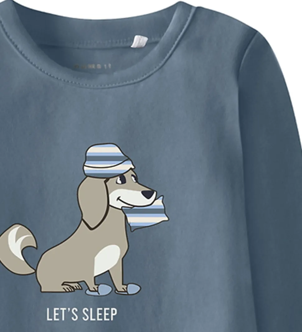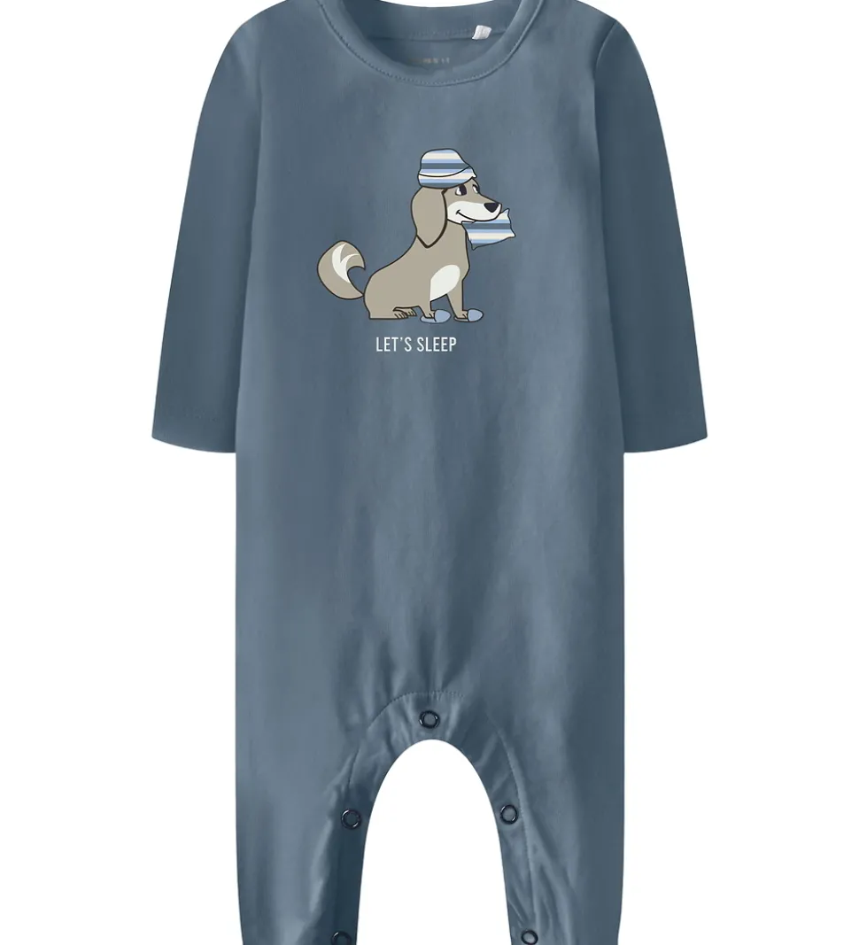 Smart Name It natdragt i støvet blå med et print på maven af en hund med nathue, hjemmesko og en pude i munden. Natdragten har lange ærmer og lange ben med mulighed for ombuk til lukkede fødder. Den lukkes med trykknapper ved venstre skulder og mellem benene.