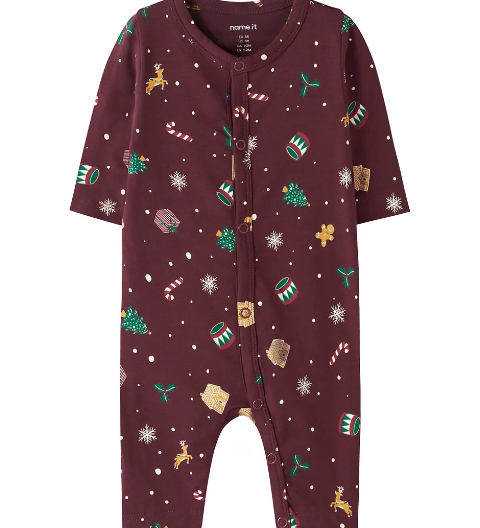 Fin natdragt fra Name It i mørkerød med et festligt juleprint. Natdragten har lange ærmer og en rund halsudskæring. Den lukkes fortil med trykknapper fra hagen til venstre fod.