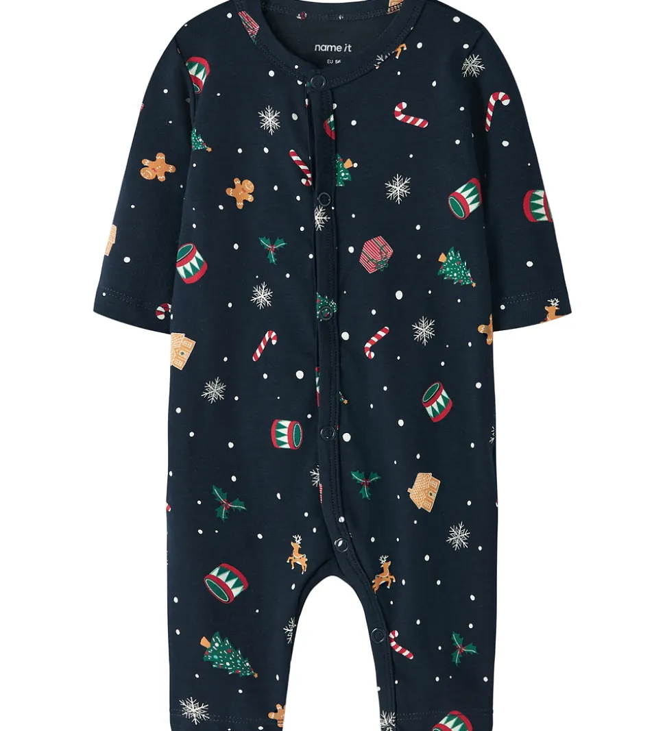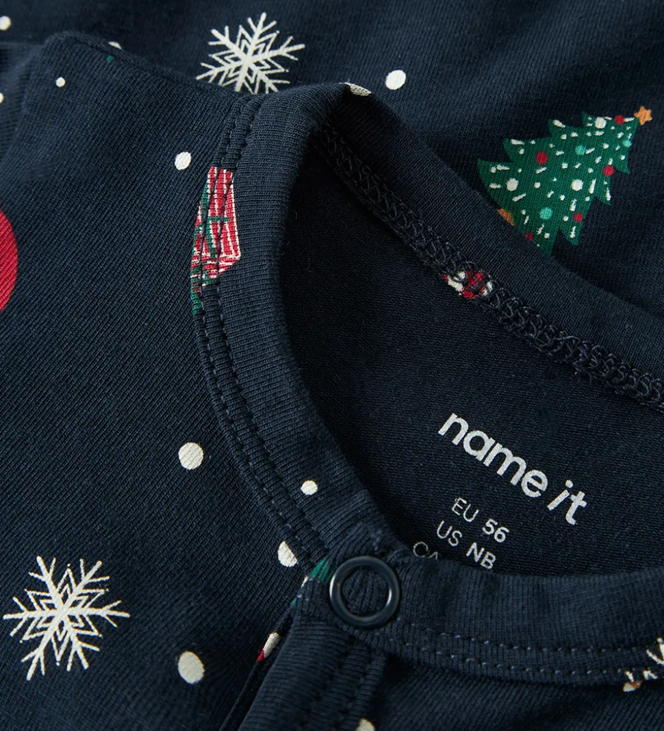Skøn natdragt fra Name It i navyblå med et festligt juleprint. Natdragten har lange ærmer og en rund halsudskæring. Den lukkes fortil med trykknapper fra hagen til venstre fod.