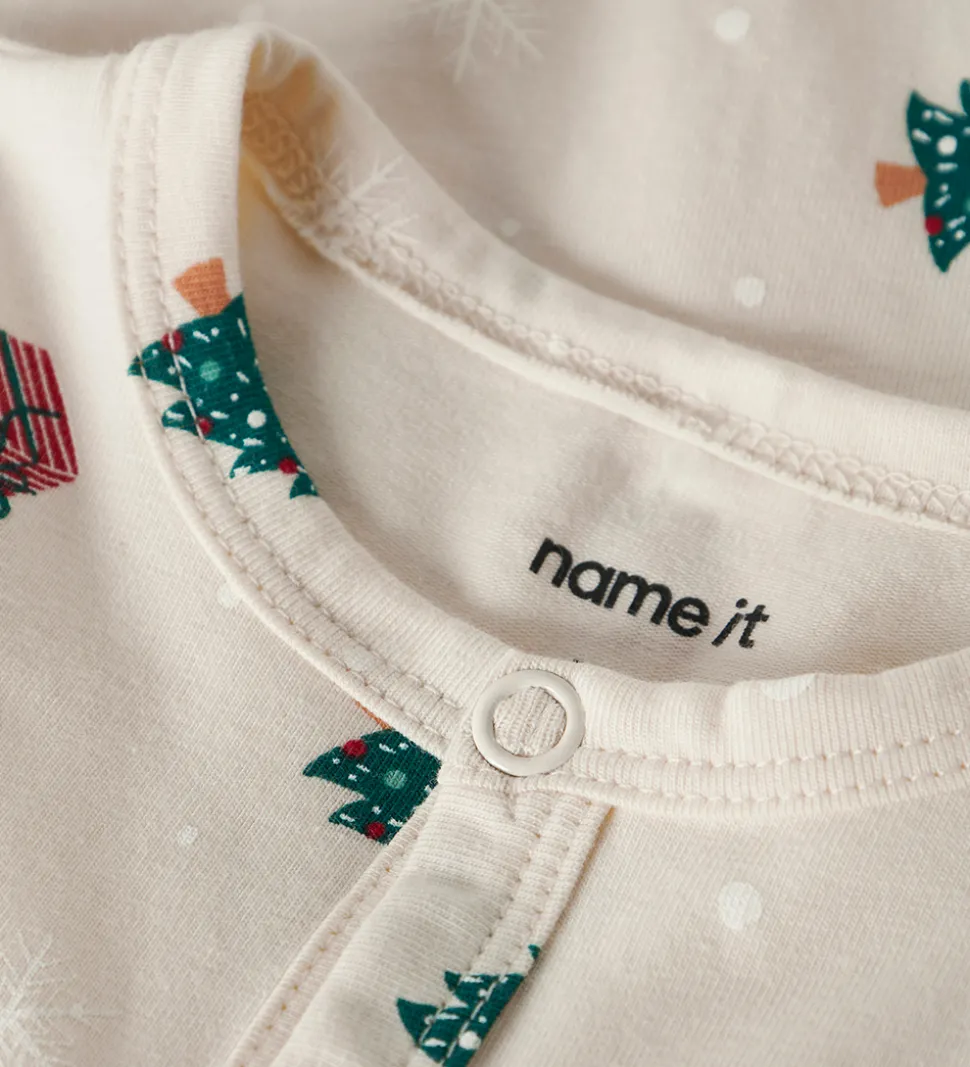 Lækker natdragt fra Name It i beige med et festligt juleprint. Natdragten har lange ærmer og en rund halsudskæring. Den lukkes fortil med trykknapper fra hagen til venstre fod.