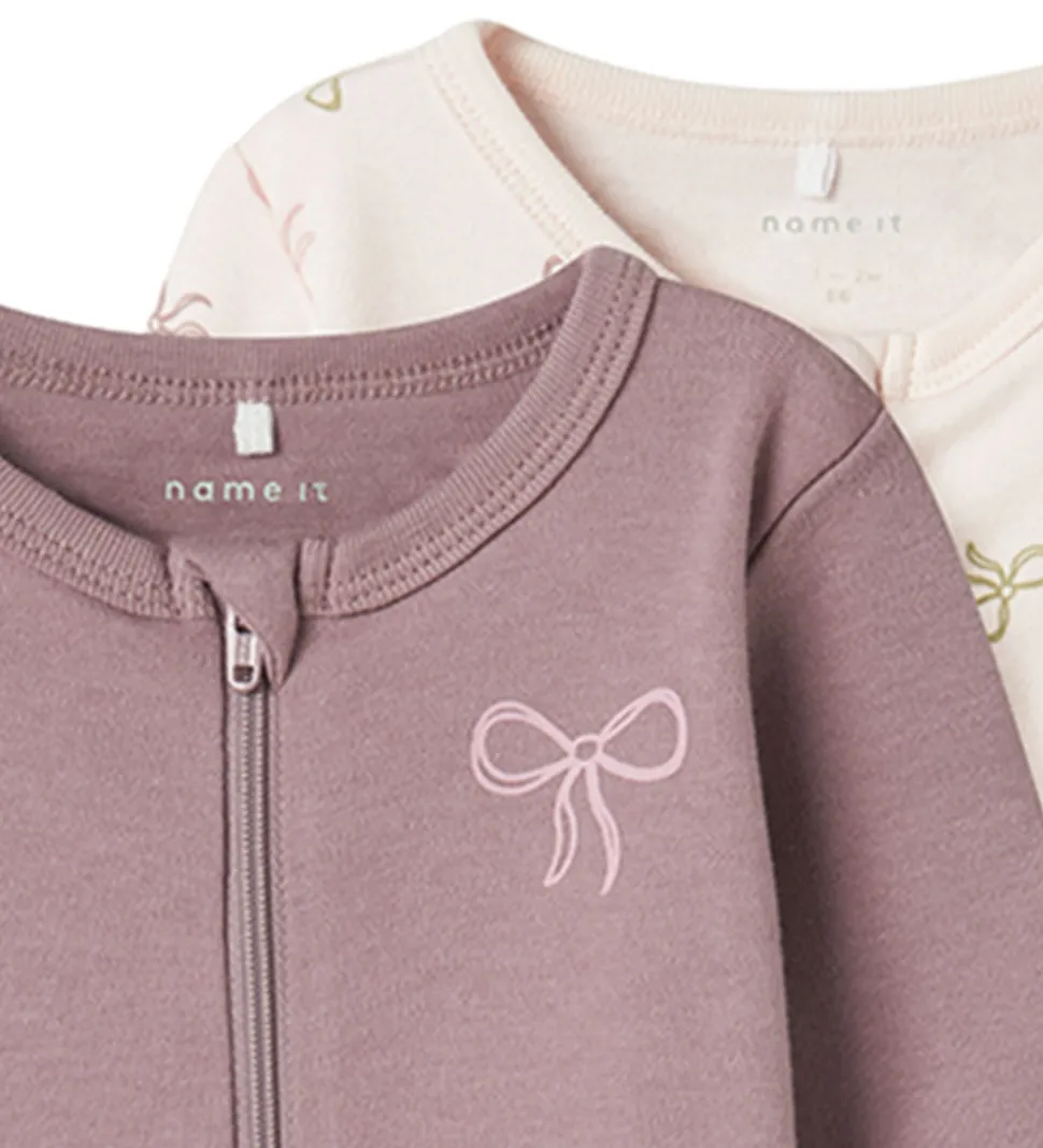 Søde Name It natdragter solgt i en 2-pak i en blød rosa og lilla farve. Den ene natdragt har et alloverprint af små sløjfer, og den anden har en enkel sløjfe i venstre hjørne. Natdragterne har lange ærmer og praktisk lynlåse, der gør påklædningen nem og hurtig.