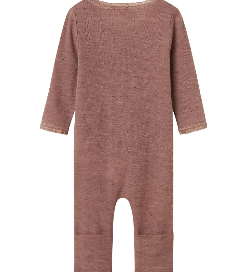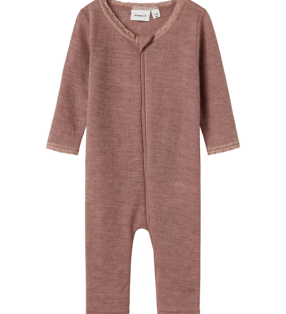 Dejlig Name It natdragt i støvet lilla med fint hulmønster og blonder i hals- og ærmeåbninger. Natdragten har en rund halsudskæring og lynlås fortil med hagesbeskytter og indvendig vindstolpe. Natdragten har lange ærmer og lange ben med mulighed for ombuk til lukkede fødder.