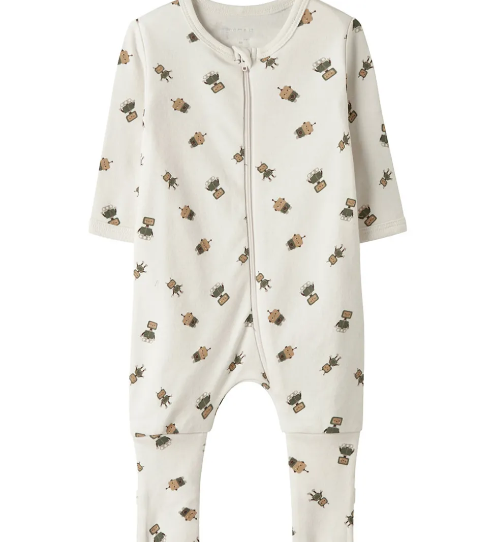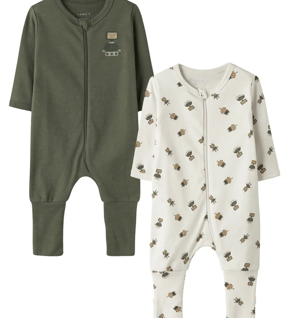 Dejlige Name It natdragter med lange ærmer solgt i en 2-pak. Den ene er ensfarvet grøn med en lille robotdetalje på brystet. Den anden natdragt er hvid med et mønster af små robotter. Natdragterne åbnes med lynlås foran, hvilket gør dem praktiske og nemme at tage på.