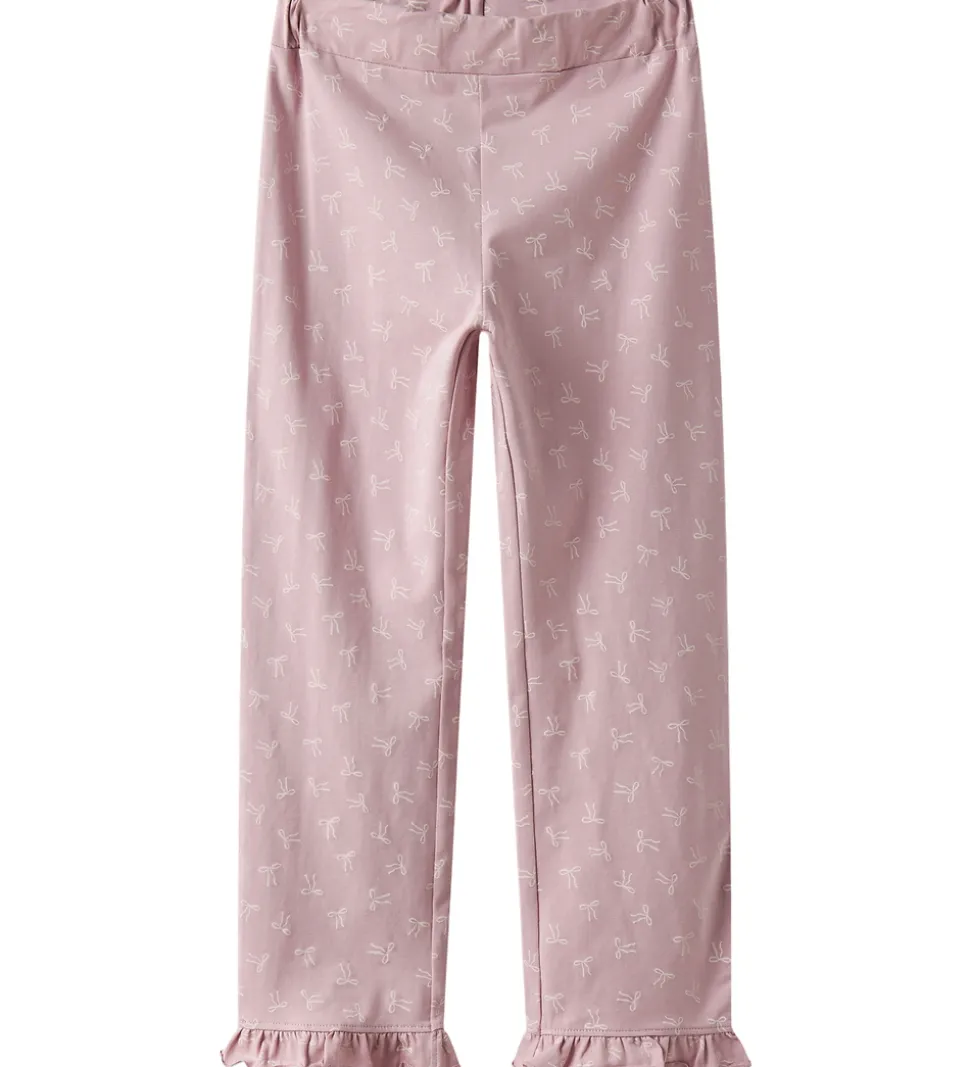 Fint Name It nattøj bestående af en natbluse og et par natbukser. Natblusen er hvid og har et print på fronten med teksten “dream” i rosa glimmer. Den har en rund halsudskæring med en smal ribkant og lange ærmer. Natbukserne er rosa og har et alloverprint af sløjfer i en lysere nuance. De har en god elastik i taljen, og i benåbningerne er der fine flæsekanter.