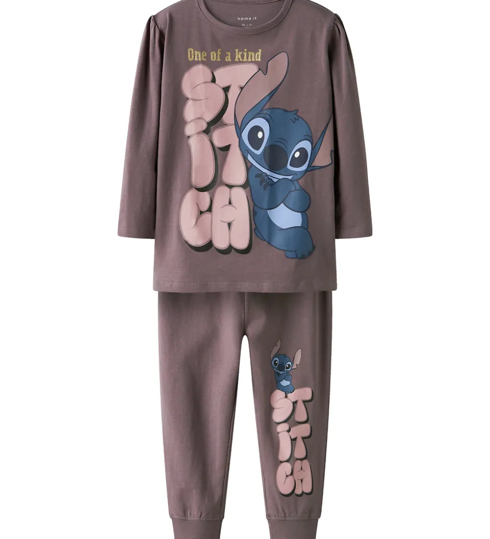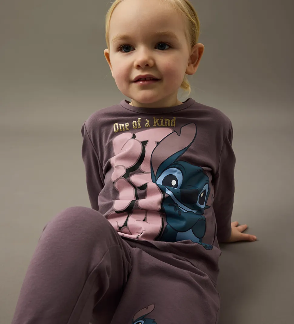 Fint Name It nattøj i støvet mørkelilla med et stort print på maven og venstre ben af Stitch. Nattøjet består af en natbluse med pufærmer og et par natbukser med lange ben og elastik i taljen.