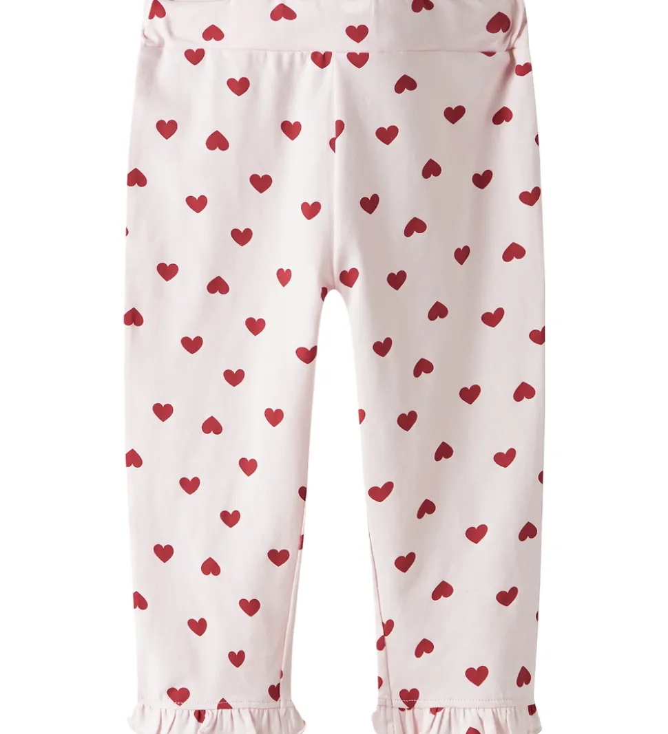 Charmerende Name It nattøj i creme med lange ærmer og fint hjerteprint. Nattøjet er todelt. Natblusen har et sødt “Sweet Dreams” print, mens bukserne prydes af små røde hjerter og flæsedetaljer ved anklerne.