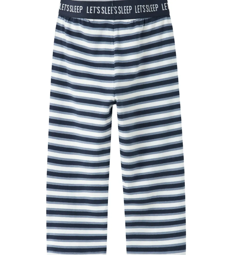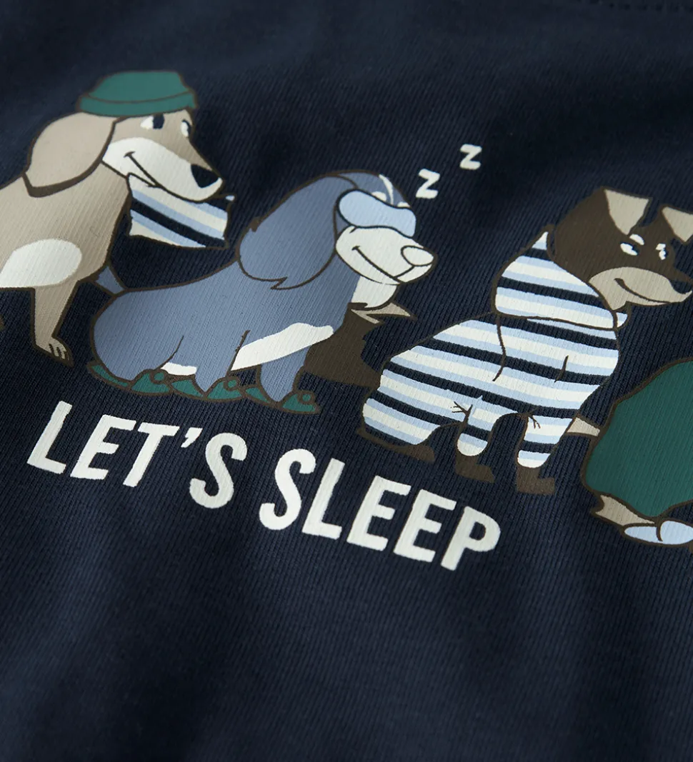 Skønt Name It nattøj bestående af en langærmet natbluse i navyblå og et par natbukser i stribet hvid, støvet blå og navyblå. Natblusen har et print af hunde med nattøj, natbriller og en pude samt teksten “Let’s Sleep”. Den har en rund halsudskæring med en smal ribkant og ribkanter ved håndleddene. Natbukserne har en god elastik i taljen og lige ben.