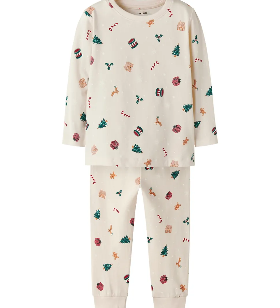 Sødt Name It nattøj bestående af en natbluse og et par natbukser i beige med alloverprint af julemotiver. Natblusen har en rund halsudskæring med en smal ribkant og lange ærmer. Natbukserne har en god elastik i taljen, og i benåbningerne er der brede ribkanter.