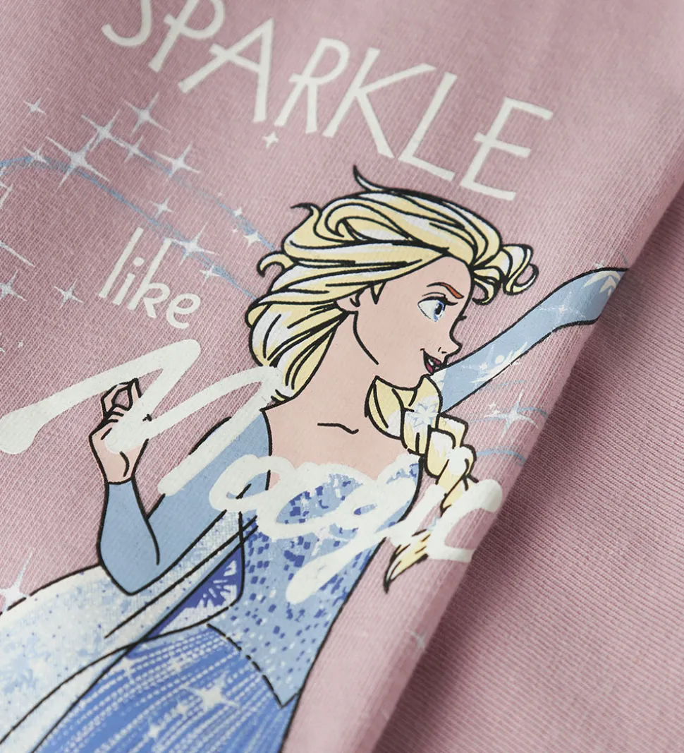 Flot Name It nattøj i en blød, rosa nuance med et Elsa-print fra Frost på fronten. Name It sættet består af en langærmet natbluse og matchende natbukser, dekoreret med glitrende detaljer.