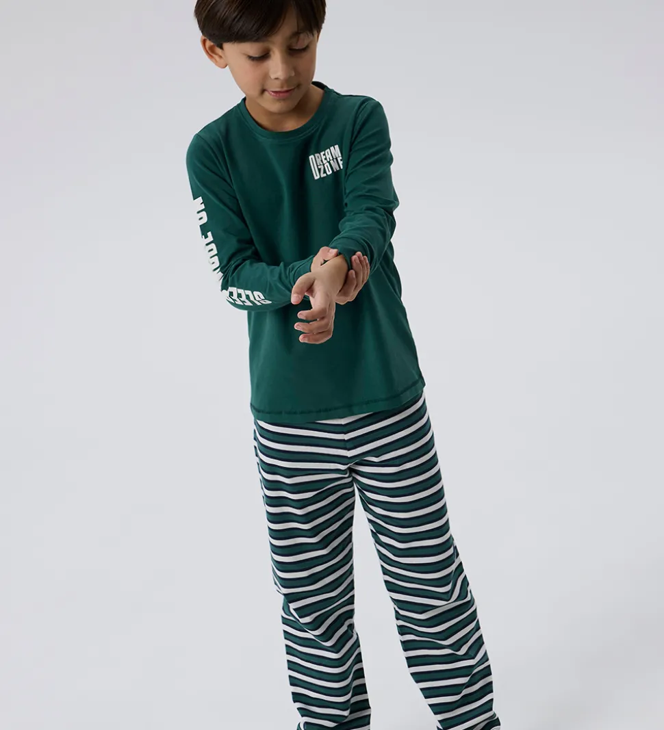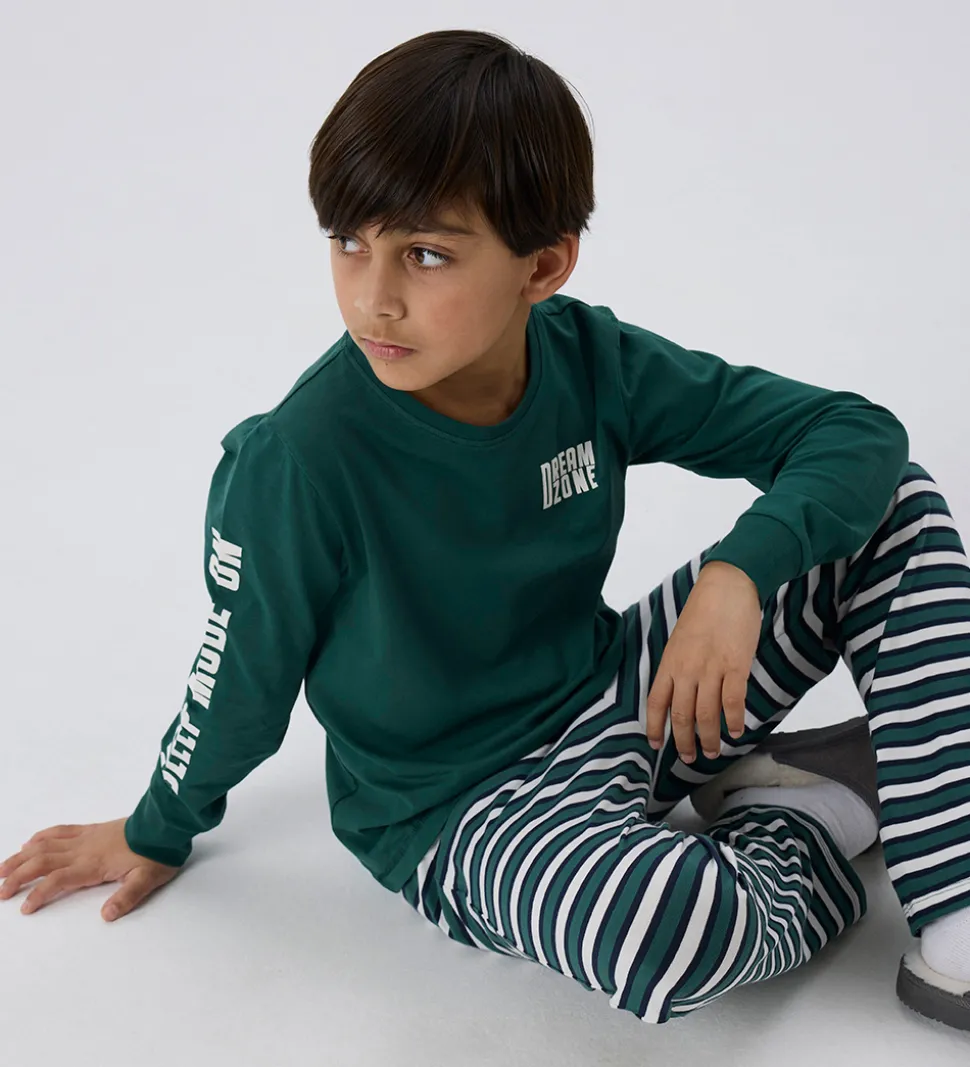 Stilfuldt Name It nattøj bestående af en natbluse og et par natbukser. Natblusen er grøn med lange ærmer og har et hvidt print på brystet og ærmet. Natbukserne har smalle striber i grøn og hvid, samt en elastisk talje der sikrer en god pasform.