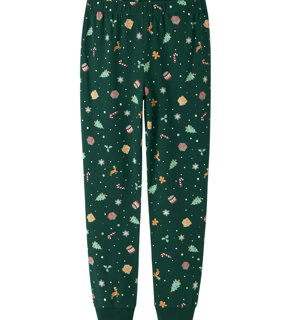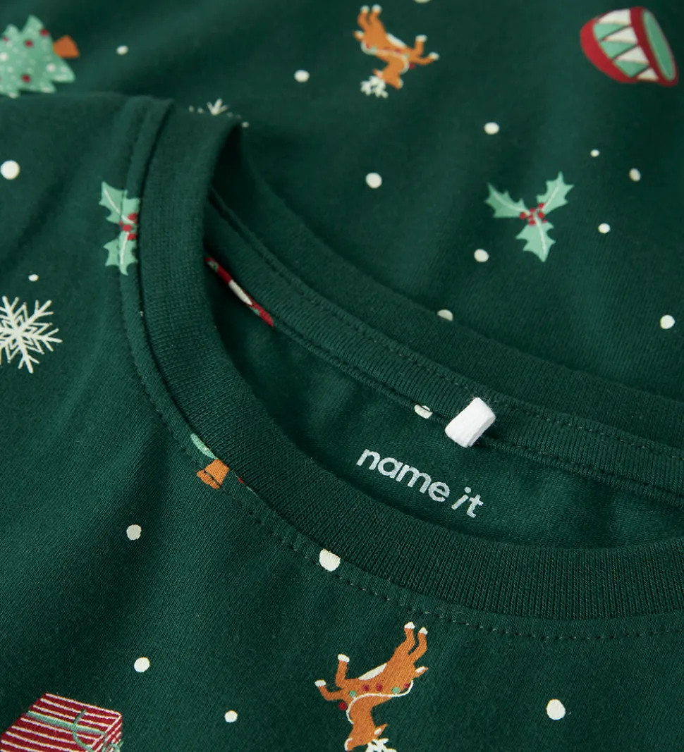 Skønt Name It nattøj i mørkegrøn med et alloverprint af julemotiver. Nattøjet består af en langærmet natbluse og et par natbukser med elastik i taljen og ribkanter ved anklerne.