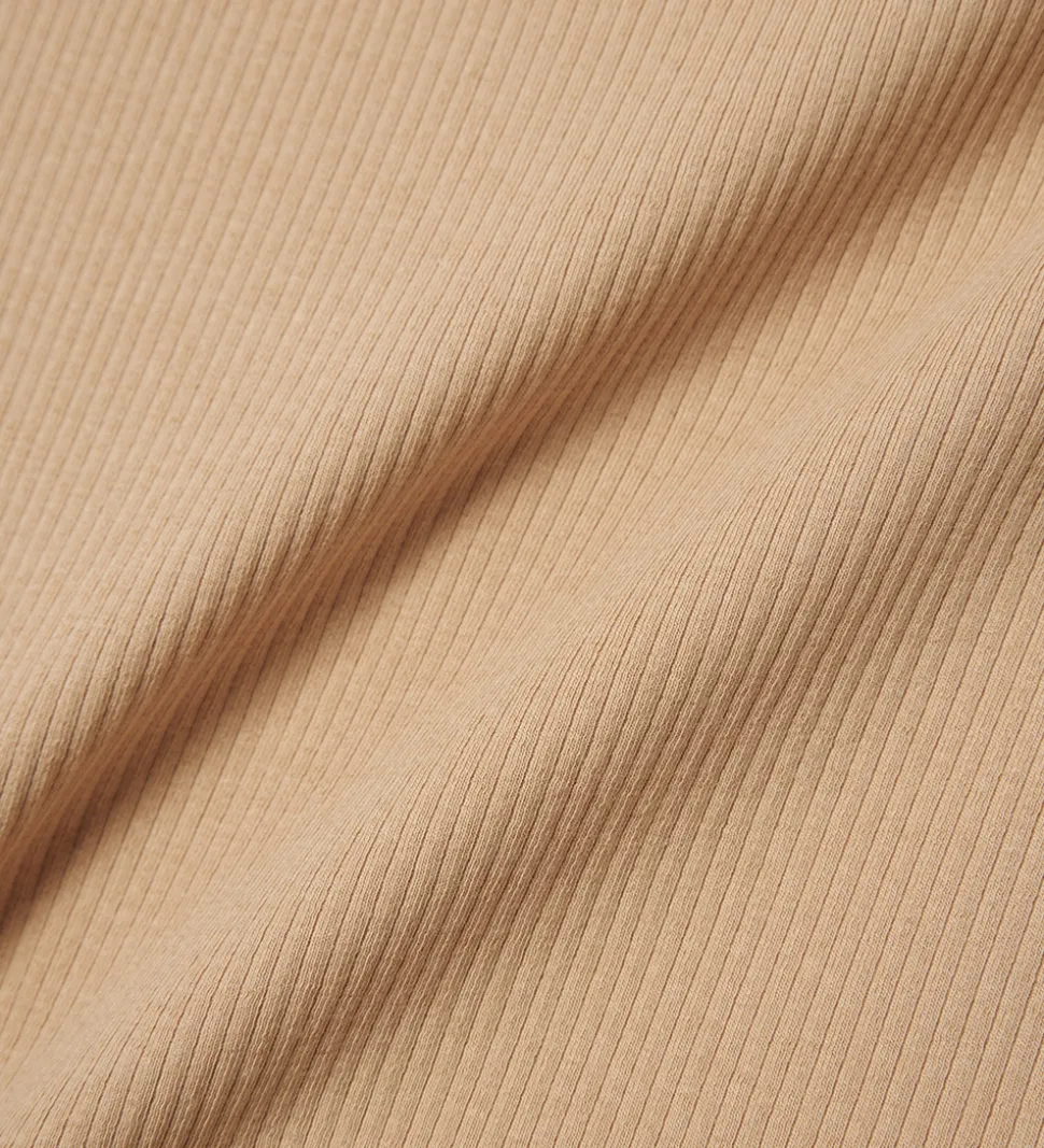 FIn Name It nederdel i beige med ribstruktur. Nederdelen er en mellemlang model med tætsiddende pasform. Den har en bred elastik i taljen, og en slids nederst i begge side.