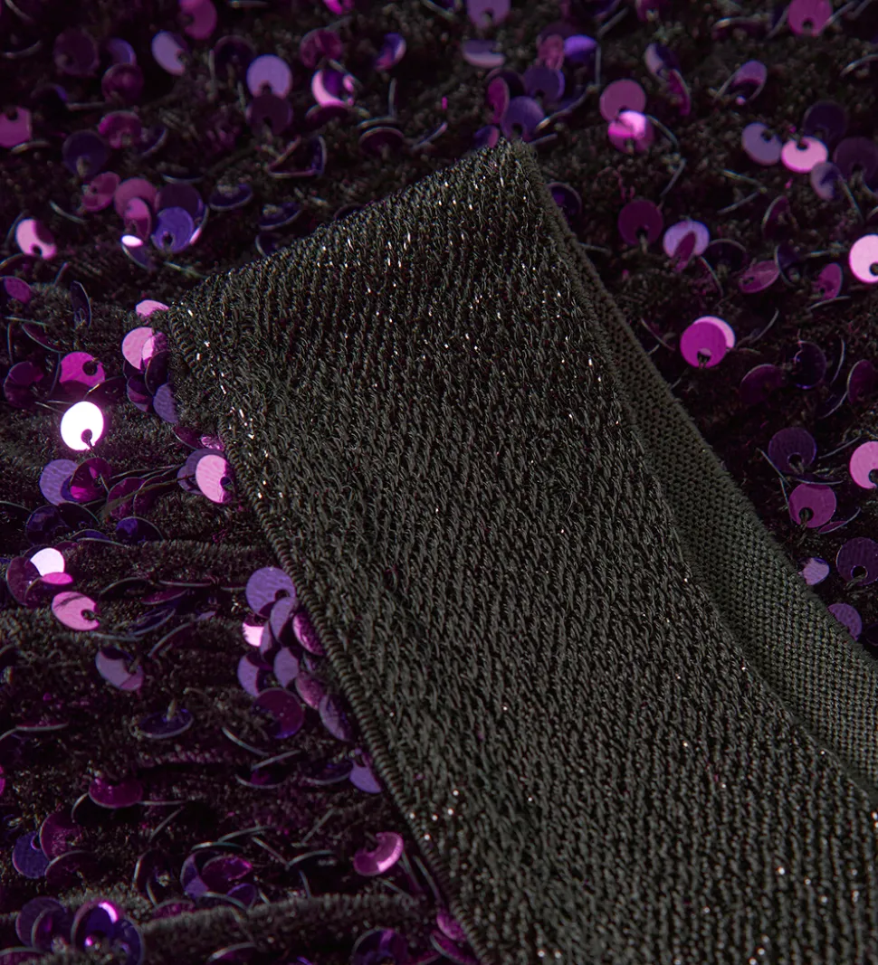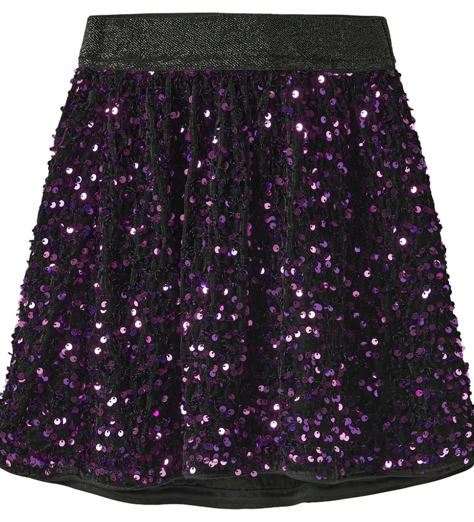 Sej Name It nederdel i sort velour med lilla palietter. Name It nederdelen har en bred elastik i taljen i sort glimmer. Nederdelen har et flot A-snit.