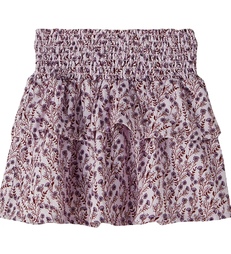 Elegant Name It nederdel med et detaljeret blomstermønster i lilla nuancer. Name It nederdelen har en elastisk talje og flotte flæsedetaljer, der skaber et let og luftigt udtryk.