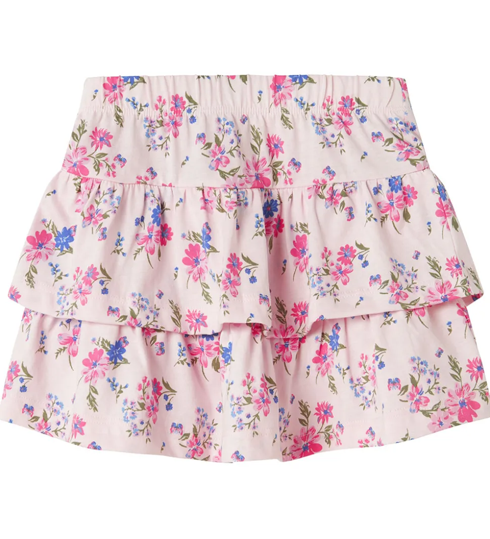 Elegant Name It nederdel i lys rosa med et smukt allover blomsterprint i lyserøde, grønne og blå nuancer.