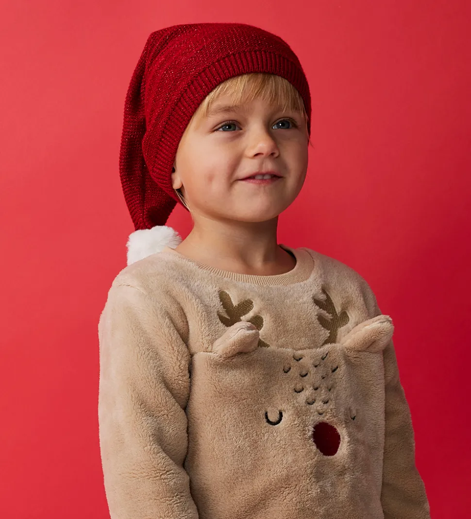 FIn Name It nissehue i rød med glimmer og en hvid kvast på toppen. Name It nissehuen har en strikket struktur med en ribkant ved åbningen, som giver en god pasform.