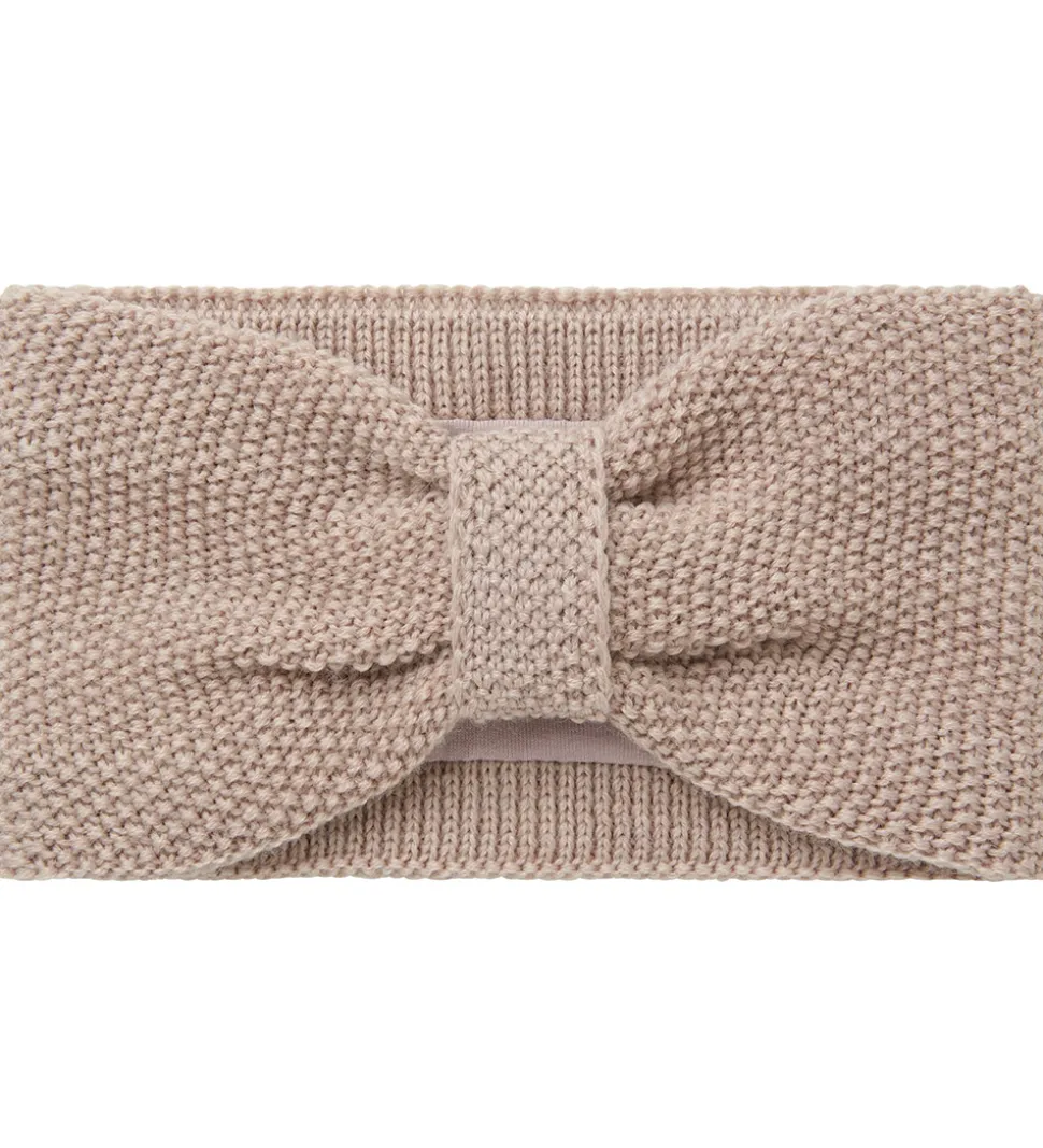 Elegant Name It pandebånd i støvet rosa med sløjfedesign. Pandebåndet har en strikket struktur og består af to lag. Inderst er der blødt bomuld, mens det yderste lag er i merinould.
