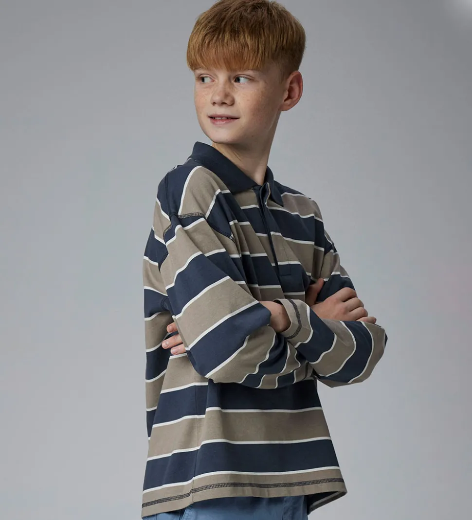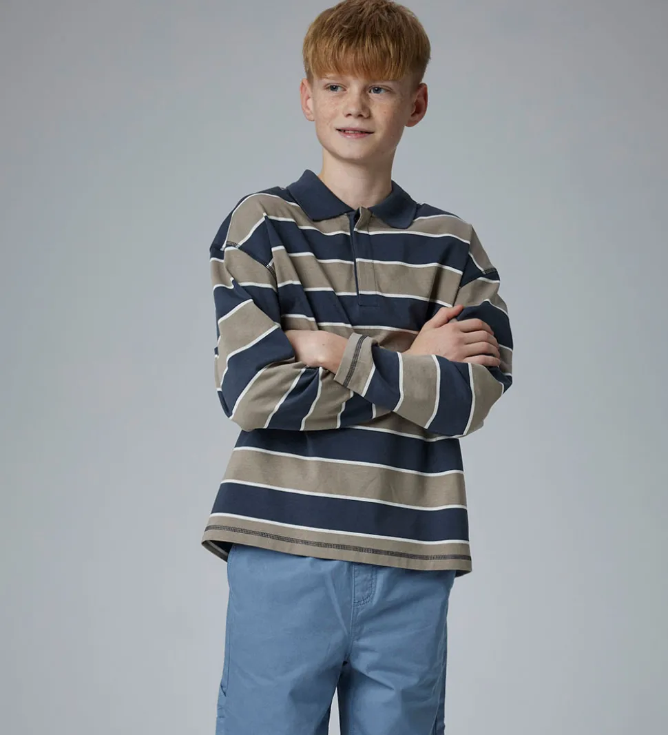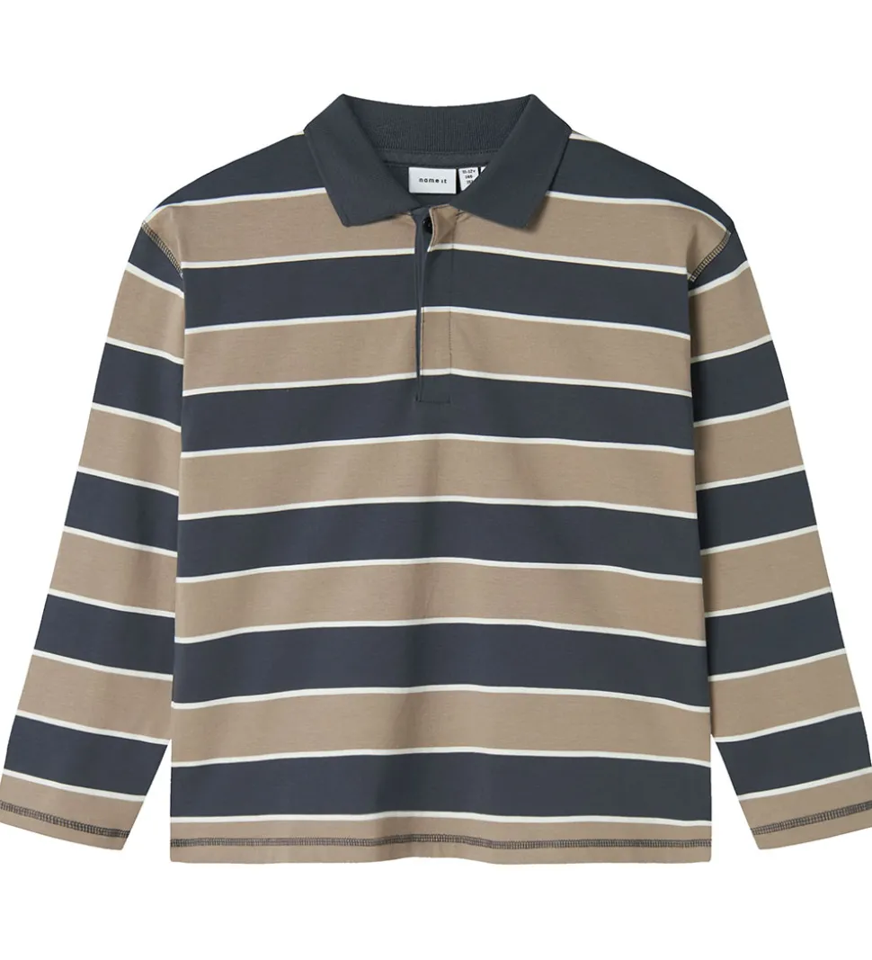 Stilfuld Name It polobluse med vandrette striber i gråblå, lysebrun og hvid. Poloblusen har en klassisk krave og skjulte knapper fortil. Den har lange ærmer, og er fremstillet i en blød kvalitet.