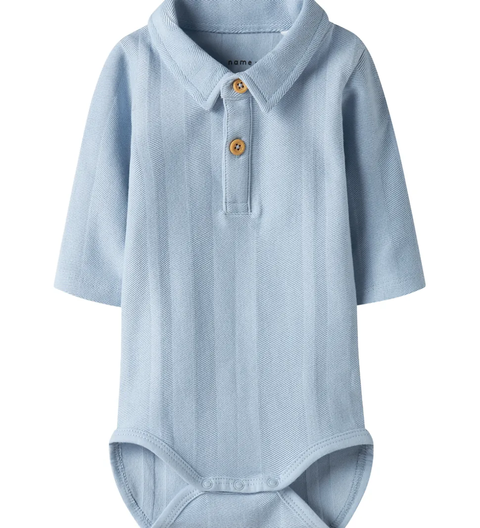 Fin Name It polobody med lange ærmer i en lyseblå nuance. Polobodyen har et diskret mønster, der tilfører et stilfuldt udtryk. Ved halsen findes en klassisk krave, som fuldendes med knapper på forsiden, der giver en ekstra detalje til designet.