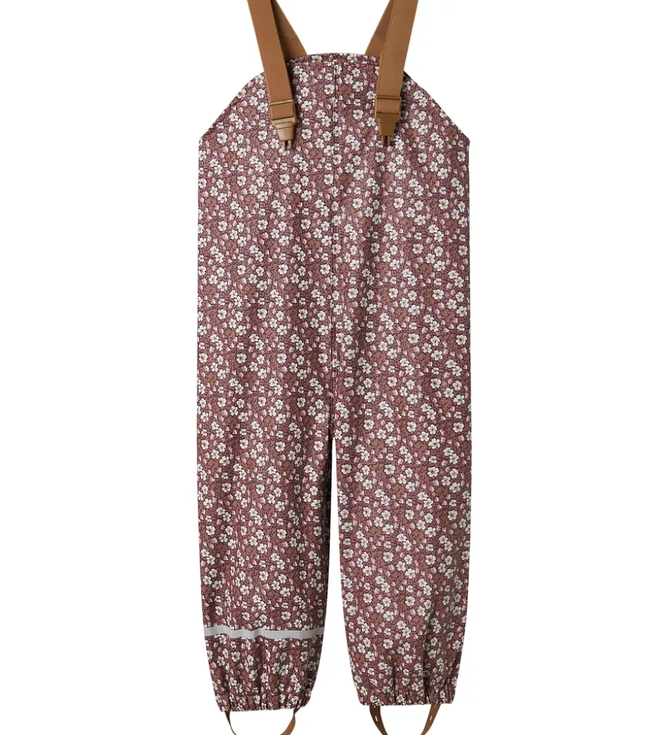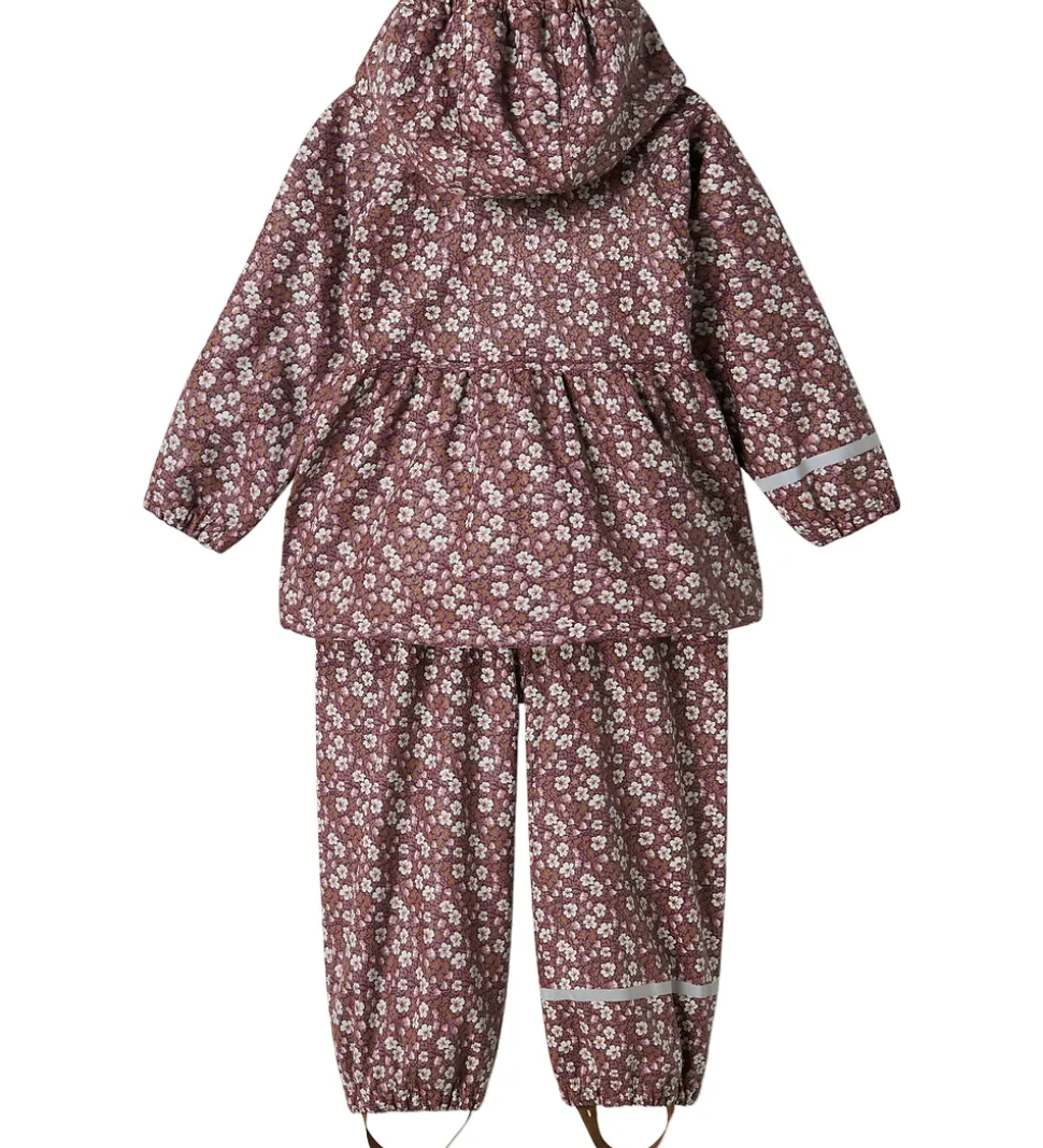 Flot Name It regntøj bestående af en regnjakke og et par regnbukser i et småblomstret alloverprint i lilla, rosa og hvid. Regntøjet har også diskrete refleks-logoprint.
