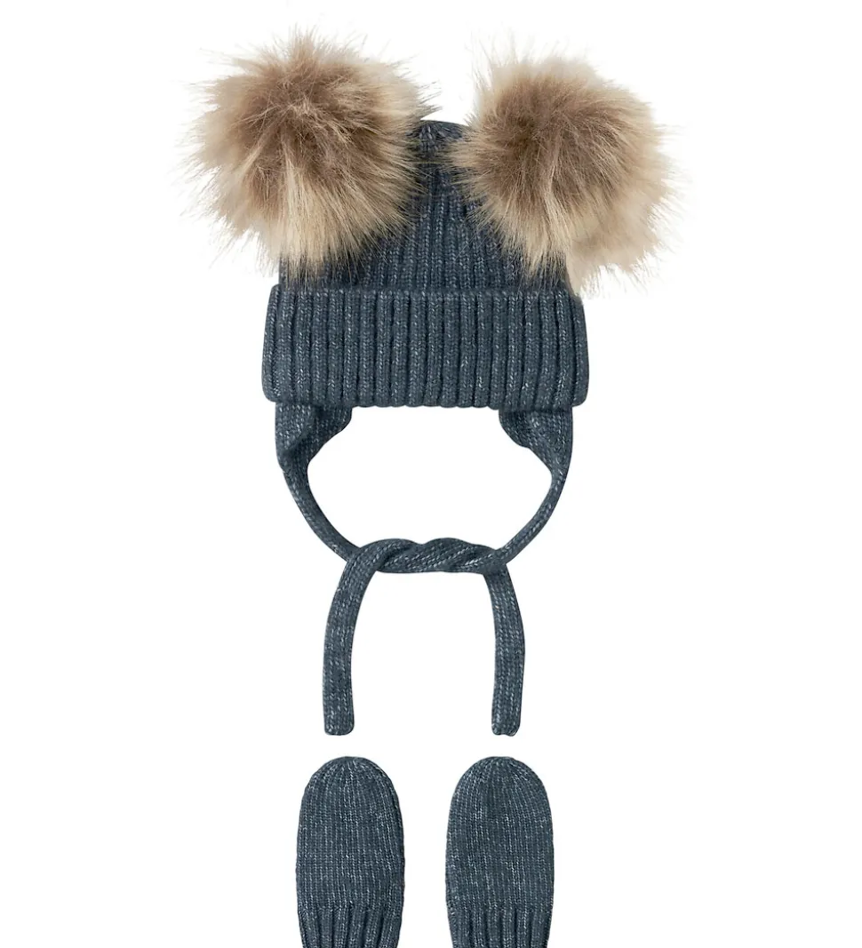 Lækkert Name It sæt bestående af en hue samt et par luffer i meleret, mørkeblå strik.