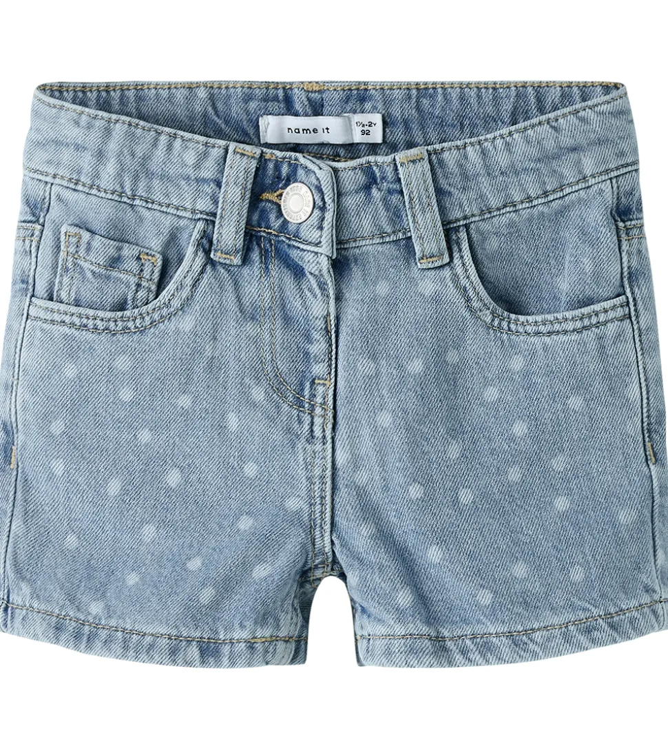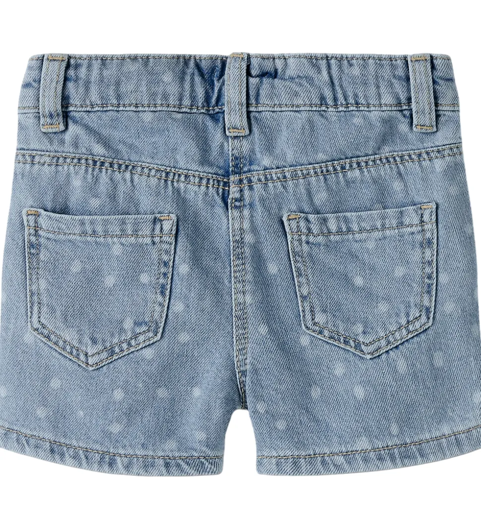 Flotte Name It shorts i en klassisk blå denim med et diskret, prikket mønster i hvid.