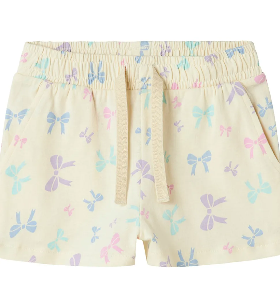Fine Name It shorts i cremefarvee dekoreret med et yndigt sløjfeprint i blå, grønne lilla og rosa nuancer. Name It shortsene har en elastisk talje med dekorative bindebånd samt praktiske sidelommer.