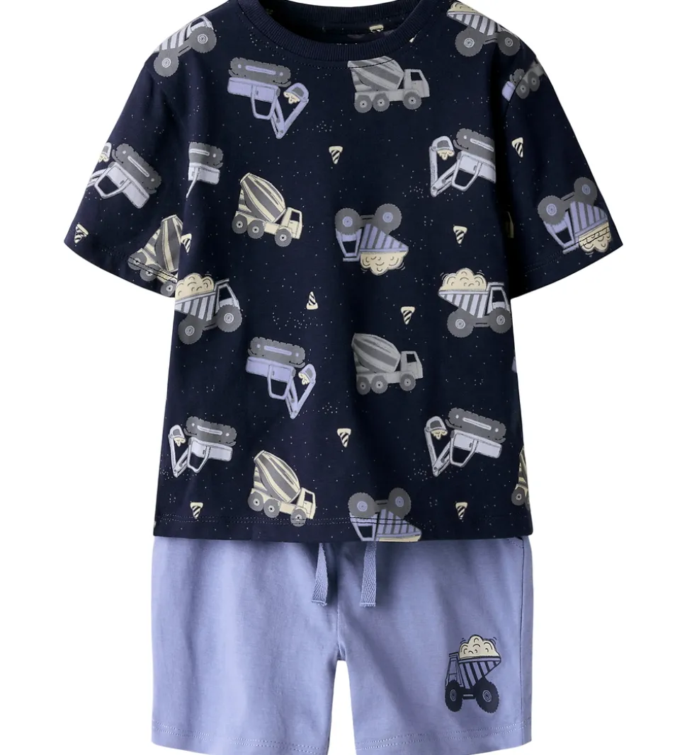 Lækkert Name It shortssæt bestående af et t-shirt og et par shorts. Name It shortsene er i en blød, blå nuance og har en komfortabel elastik i taljen og praktiske snører foran. T-shirten er i navyblå med et spændende transportmiddel-print.