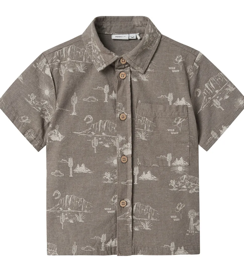 Lækker Name It skjorte med korte ærmer i en gråbrun nuance med et flot print, der viser bjerge og kaktuser. Skjorten har knaplukning og en brystlomme, hvilket tilføjer et praktisk touch til designet.