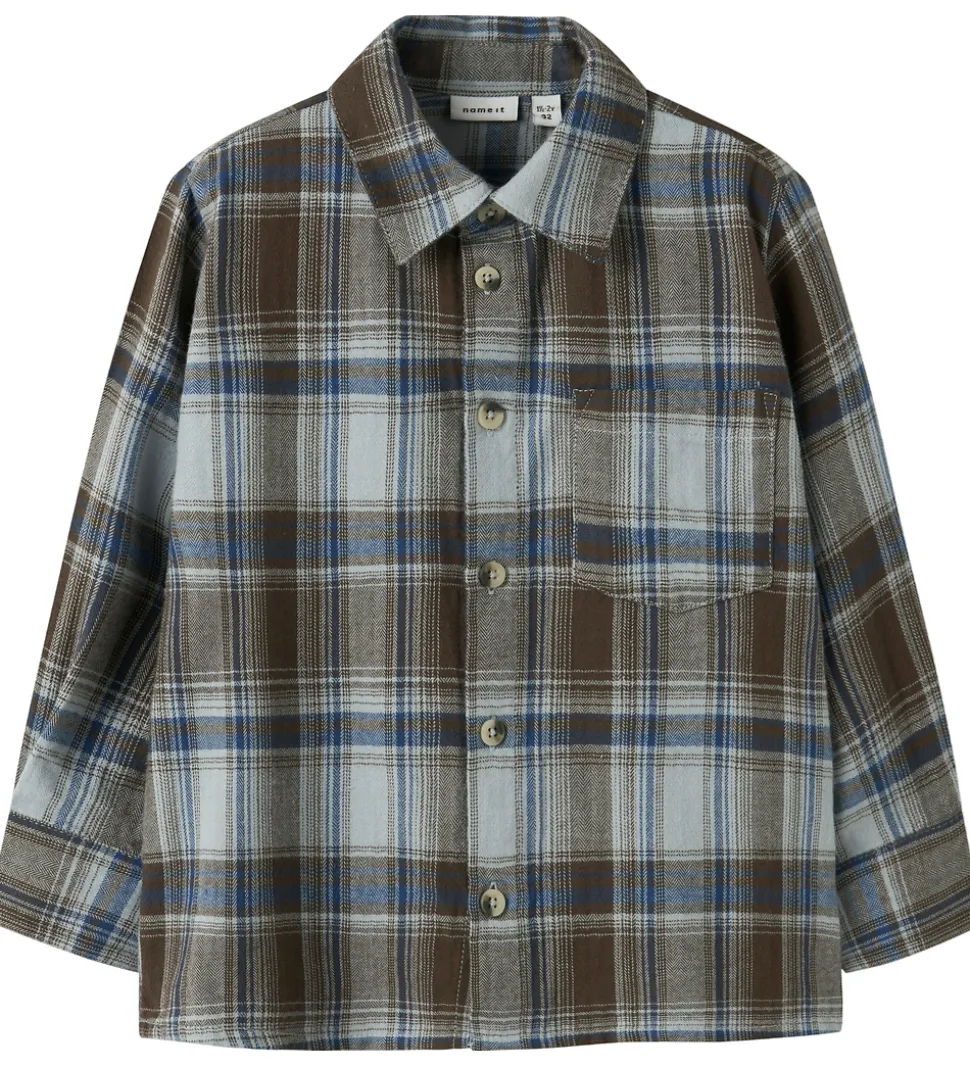 Skøn skjorte fra Name It i et ternet mønster i brune og blå nuancer. Skjorten har en traditionel krave og lange ærmer. Skjorten har gennemgående knaplukning fortil og en brystlomme i venstre side. Skjorten er fremstillet i en blød bomuldskvalitet.