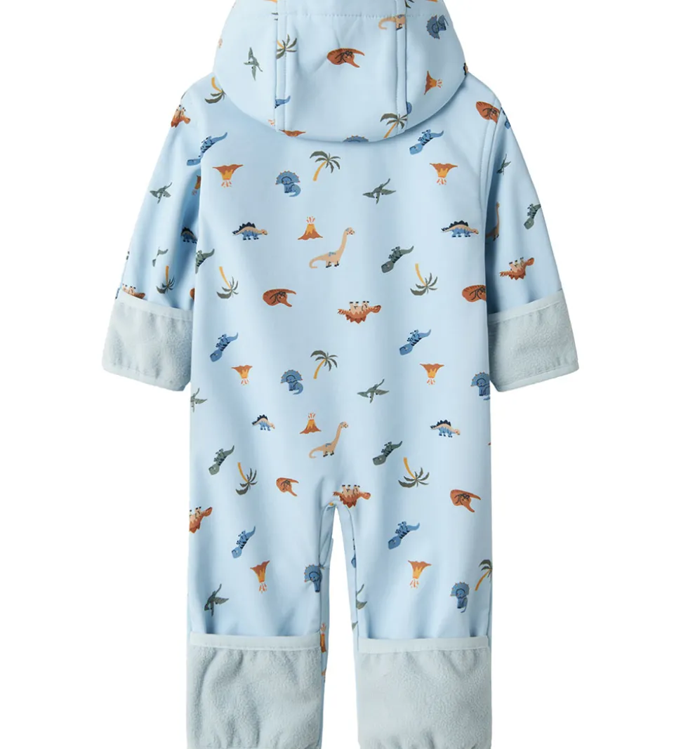Dejlig Name It softshelldragt i lyseblå med et alloverdinoprint.