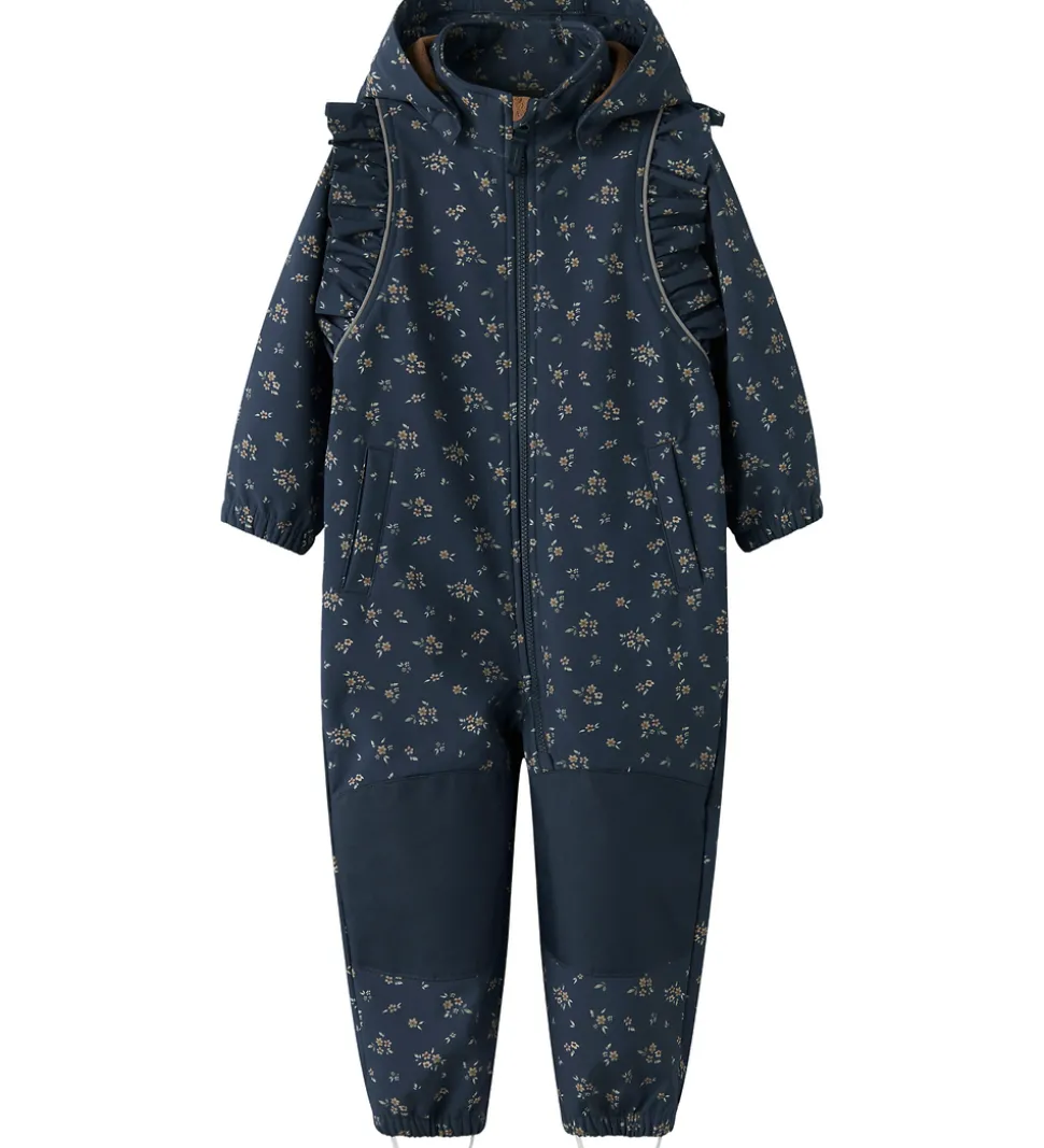 Dejlig Name It softshelldragt i mørkeblå med et fint alloverblomsterprint. Omkring skuldrene er softshelldragten dekoreret med flotte flæsekanter.