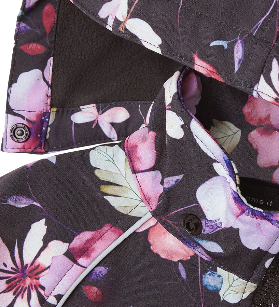 Dejlig Name It softshelldragt i sort med et alloverprint af blomster og sommerfugle i rosa, lilla og grønne nuancer.