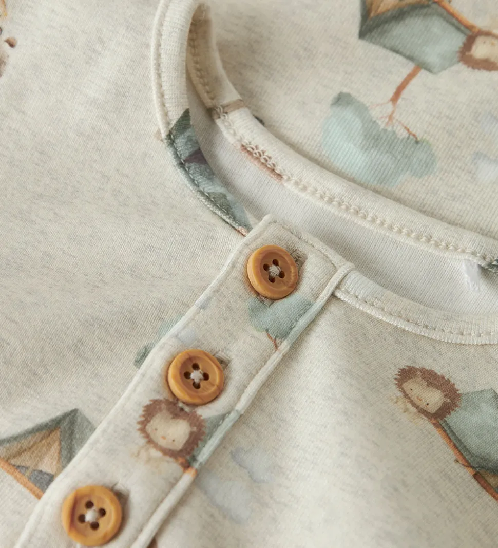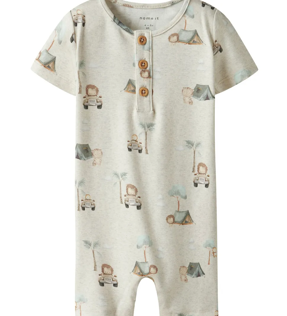 Charmerende Name It sommerdragt i meleret beige med korte ærmer. Sommerdragten prydes af et sjovt print med biler, telte og træer i afdæmpede farver. Perfekt til små eventyrere.