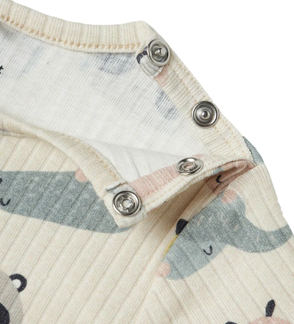 Lækker Name It sommerdragt med ribstruktur og charmerende print af dyrehoveder i forskellige farver. Sommerdragten har korte ærmer og en rund halsudskæring med trykknapper ved venstre skulder. Sommerdragten har korte ben med trykknapper mellem benene.