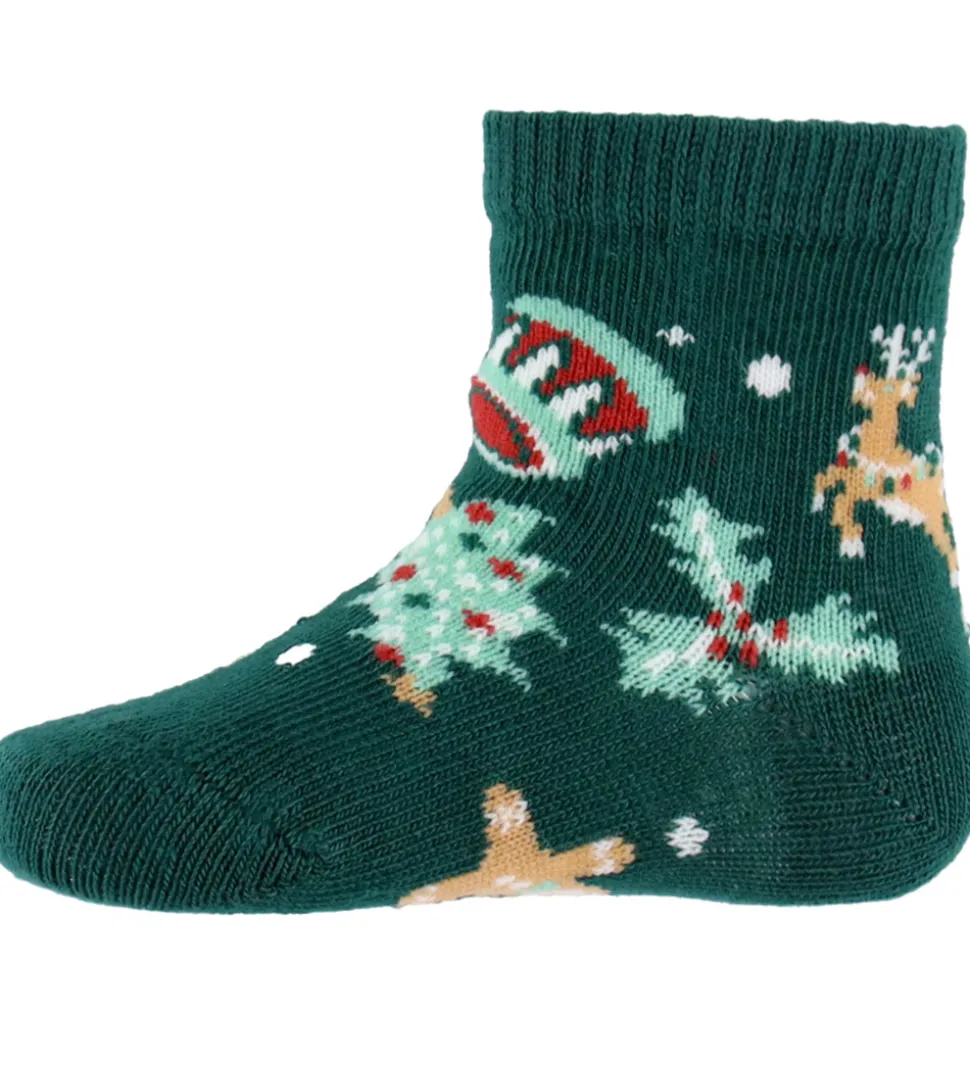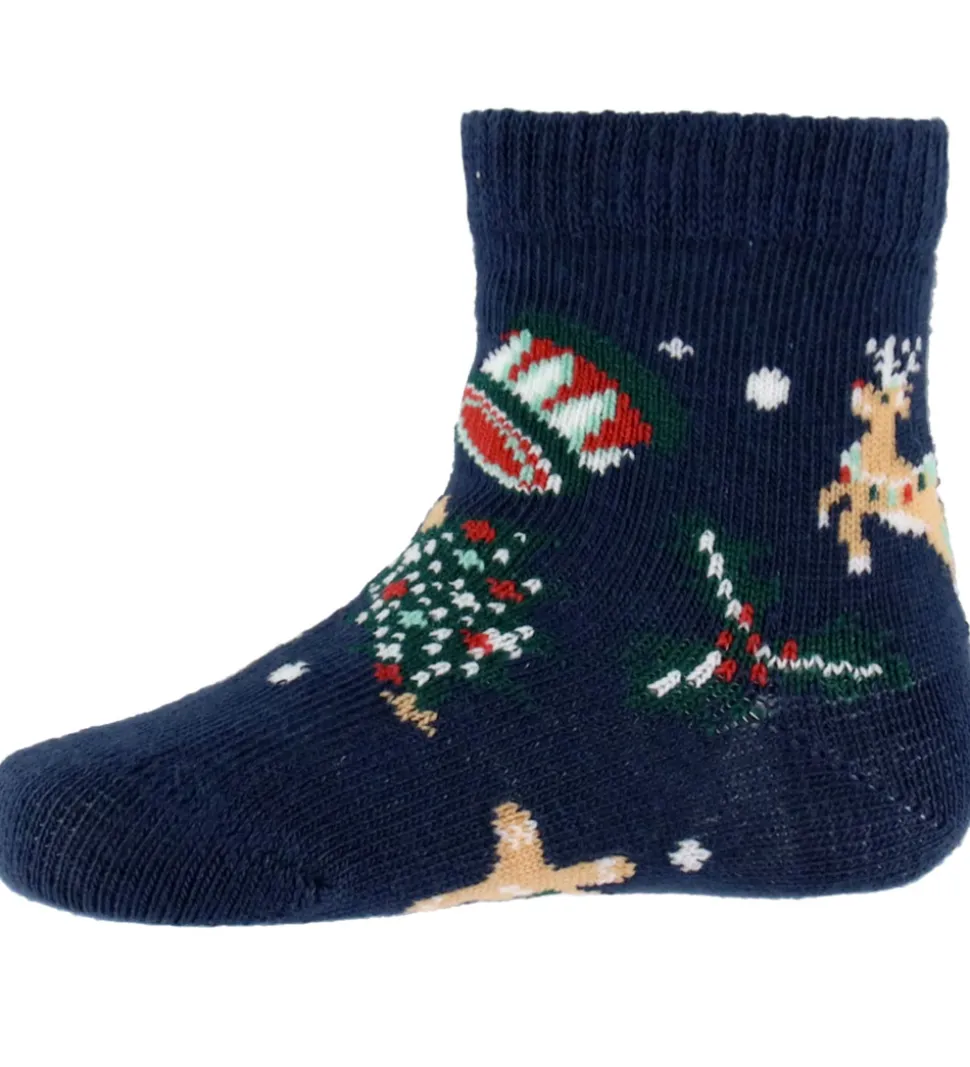 Charmerende Name It strømper solgt i en 3-pak i grøn, blå og rød med julemotiver, herunder juletræer og rensdyr. Strømperne har et skaft med ribkant øverst, hvilket sikrer en god pasform.