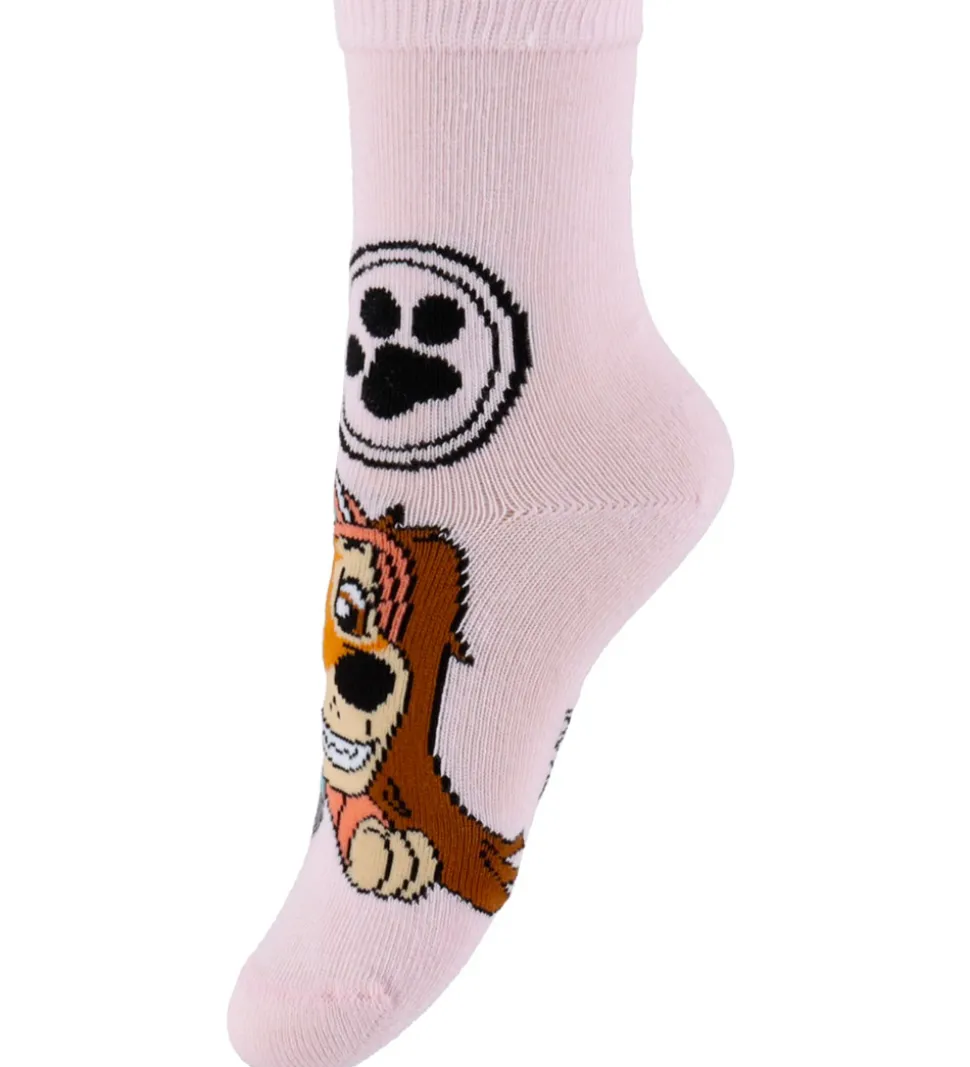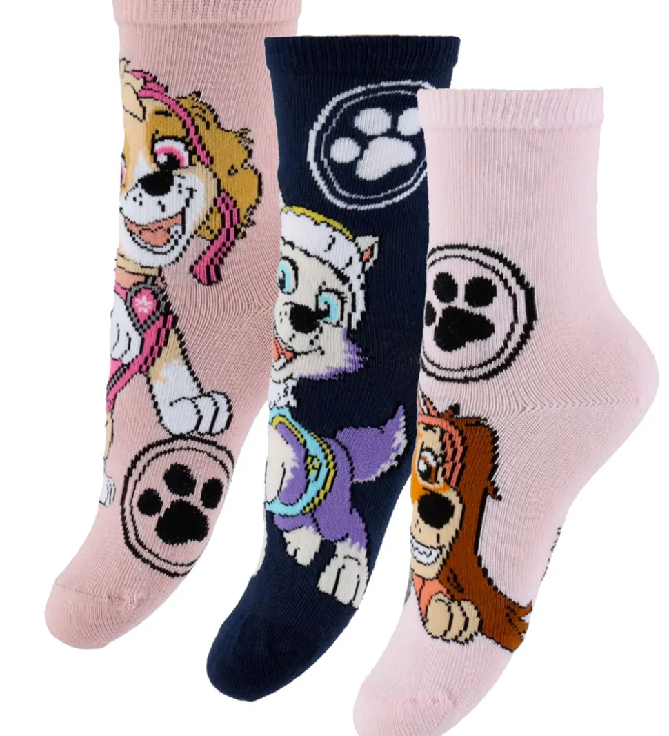 Charmerende Name It strømper i en 3-pak med designs i lyserød, mørkeblå og mørkerosa, prydet med motiver af forskellige karakterer fra Paw Patrol.