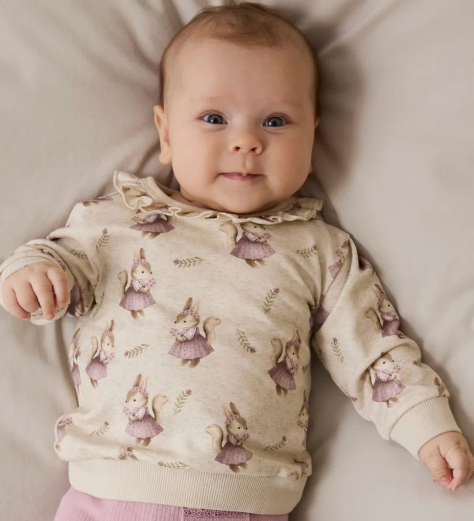 Charmerende Name It sweatshirt i meleret lys beige med sødt print af små egern med kjoler på. Name It sweatshirten har lange ærmer med brede ribkanter og en rund hals med flæsekant. Den lukkes med en trykknap ved venstre skulder. Indvendigt er der blødt, børstet bomuld.