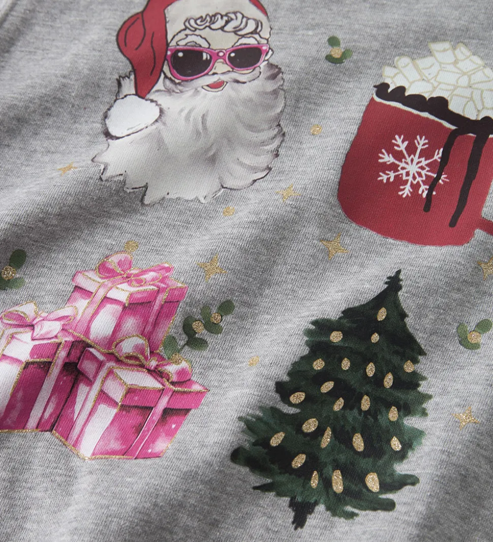 Skøn Name It sweatshirt i gråmeleret med print af julemotiver med glimmerdetaljer på fronten. Name It sweatshirten har en rund halsudskæring og lange ærmer. Indvendigt er der blødt, børstet bomuld.