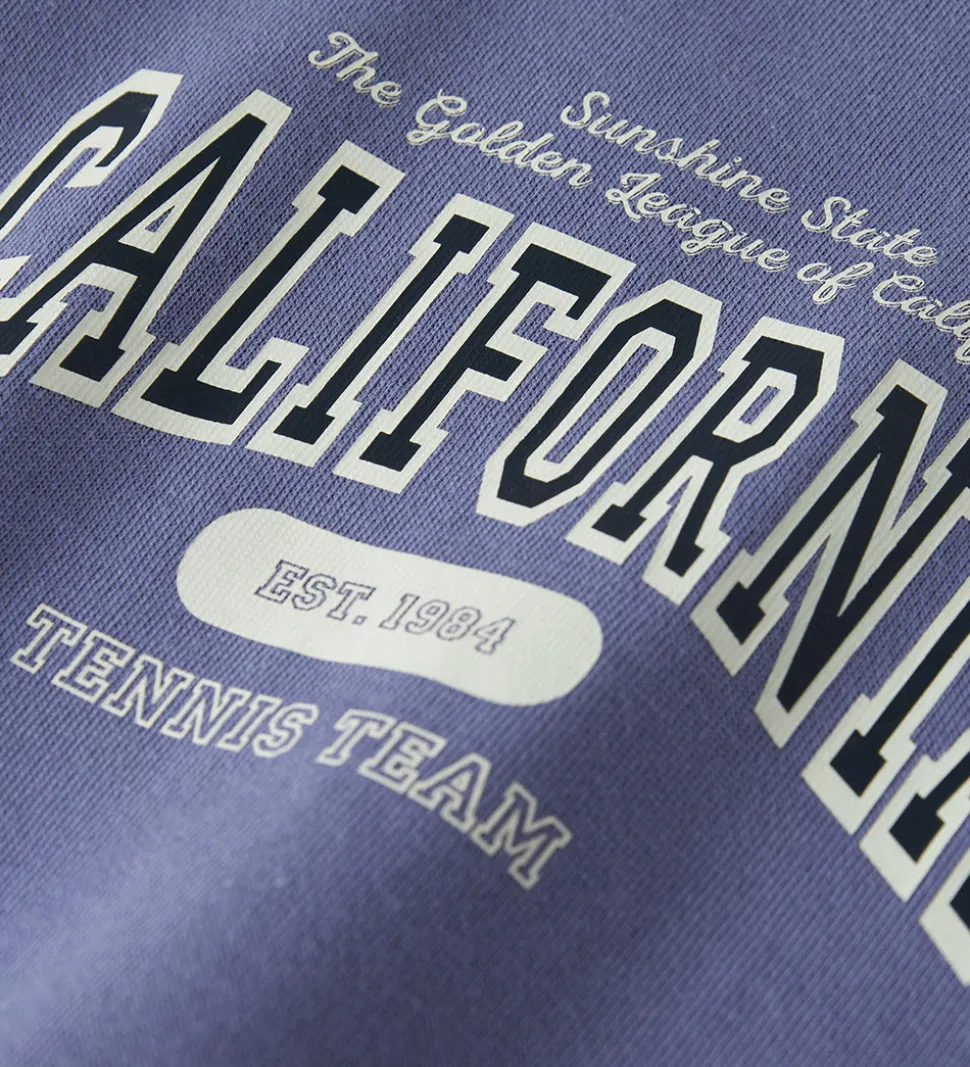 Stilfuld Name It sweatshirt i blå med et lilla skær, med et print af ordet “CALIFORNIA” på forsiden. Name It sweatshirten er designet med lange ærmer og en rund halsudskæring, hvilket giver et enkelt og moderne look. Den har ribkanter ved håndleddene og kanten, som tilføjer en ekstra detalje til designet.