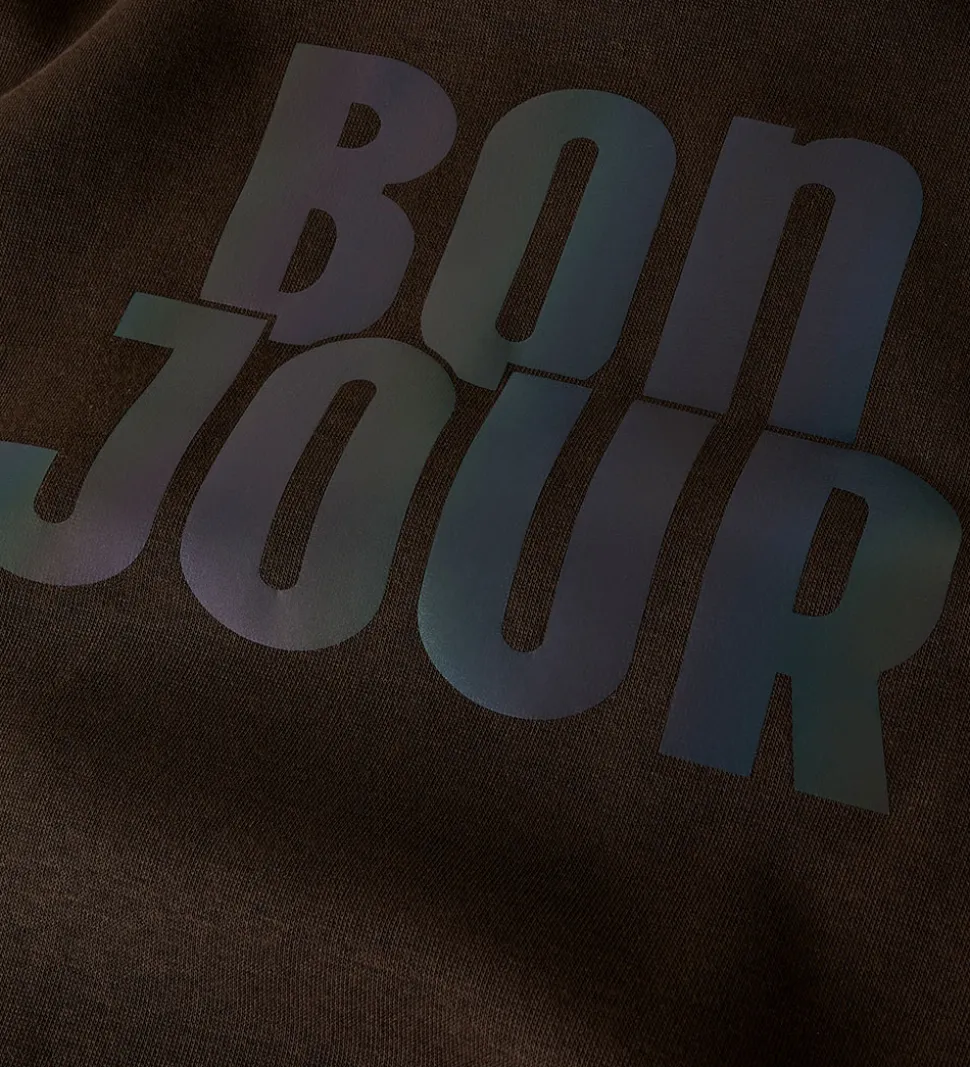 Stilfuld Name It sweatshirt i mørkebrun med teksten “Bonjour” med holografisk effekt på venstre bryst samt på ryggen. Sweatshirten har en rund halsudskæring med en smal ribkant og lange ærmer med brede ribkanter i ærme- og taljeåbning. Indvendigt er der blødt, børstet bomuld.