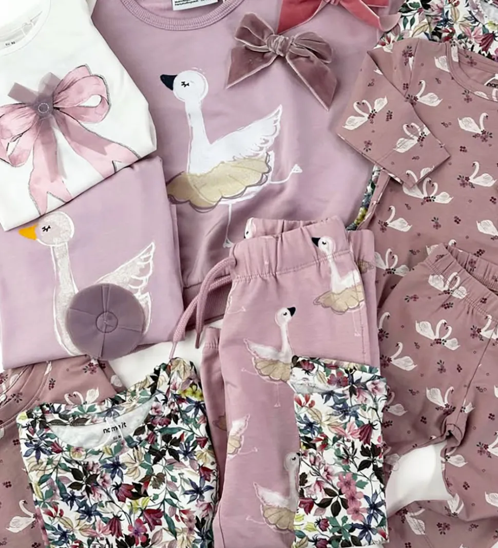 Fin Name It sweatshirt i rosa med et elegant svanemotiv på fronten. Sweatshirten en rund halsudskæring med en smal ribkant og lange ærmer med elastik ved håndleddene. Indvendigt er der blødt, børstet bomuld.
