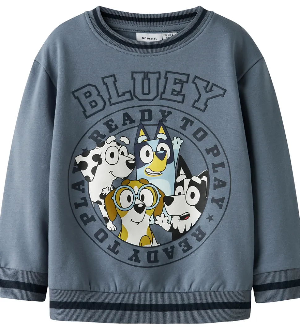 Flot Name It sweatshirt i støvet blå med et stort, farverigt Bluey-print foran. Sweatshirten har ribkanter med sorte kontraststriber ved hals-, ærme- og taljeåbning. Indvendigt er de blødt, børstet bomuld.