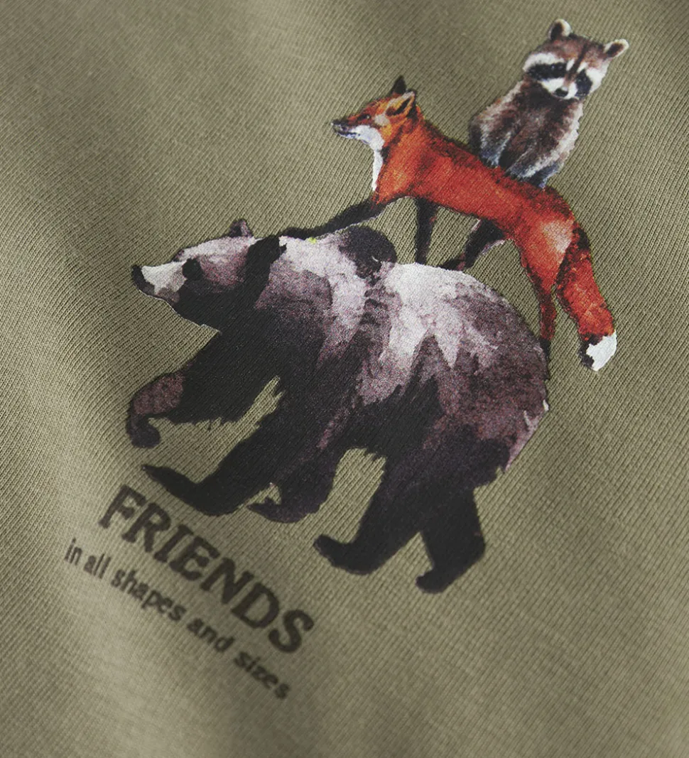 Skøn Name It sweatshirt i en afdæmpet grøn nuance med print af tre vilde dyr på venstre bryst og teksten “Friends In All Shapes And Sizes”. Sweatshirten har lange ærmer og en rund halsudskæring med ribkanter ved alle åbninger. Indvendigt er der blødt, børstet bomuld.