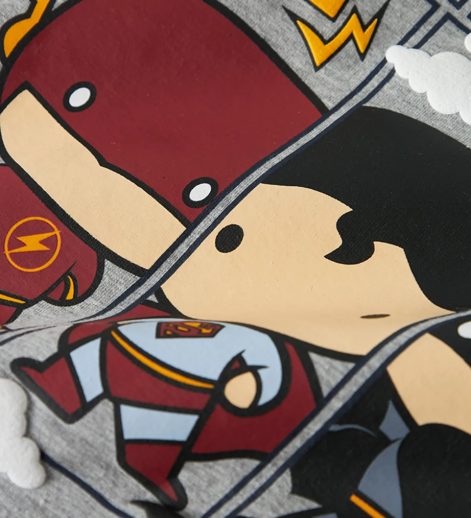 Smart Name It sweatshirt i gråmeleret med et stort print på fronten af superheltene The Flash, Superman og Batman. På venstre ærmet er der applikationer af superheltenes logoer. Name It sweatshirten har lange ærmer, rund halsudskæring og ribkanter. Indvendigt er der blødt, børstet bomuld.