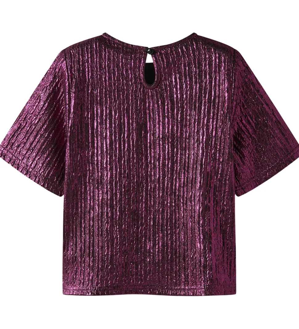 Smuk Name It t-shirt i en iøjnefaldende metallisk lilla. T-shirten har en elegant struktur med lodrette linjer, der skaber et raffineret udtryk. Name It t-shirten er designet med en rund halsudskæring og korte ærmer, hvilket giver en klassisk og enkel stil.
